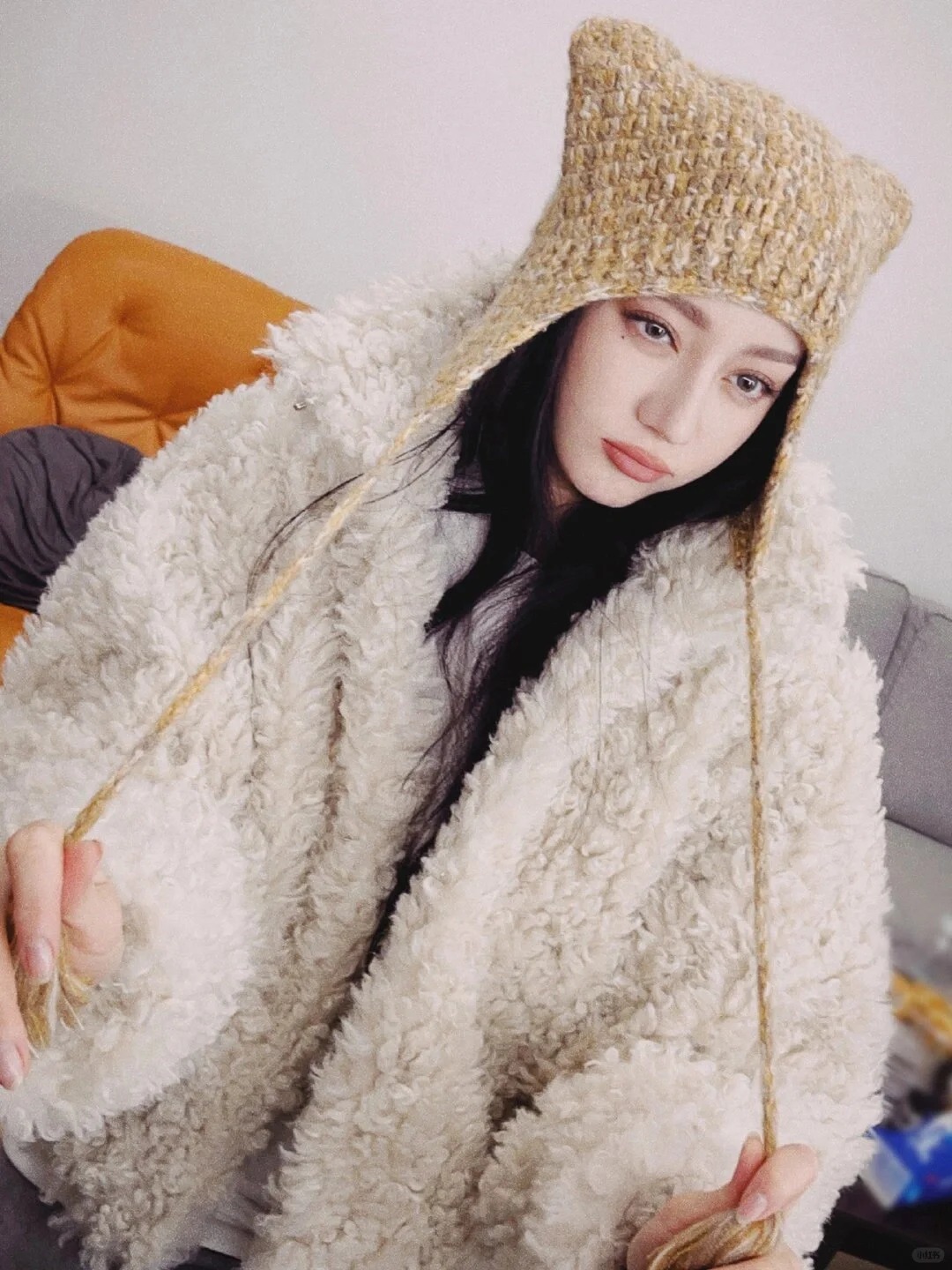 这次的热巴身穿一件杏色毛绒外套,配上一顶像猫猫耳朵一样的针织帽,保暖又俏皮。下身搭配一条渐变色牛仔裤,让她一秒美出圈,简直太可爱了!
