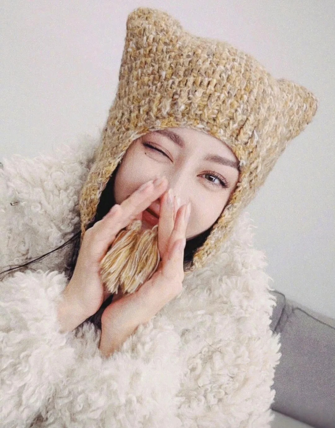 迪丽热巴晒自拍,戴猫猫帽的她太可爱了~~