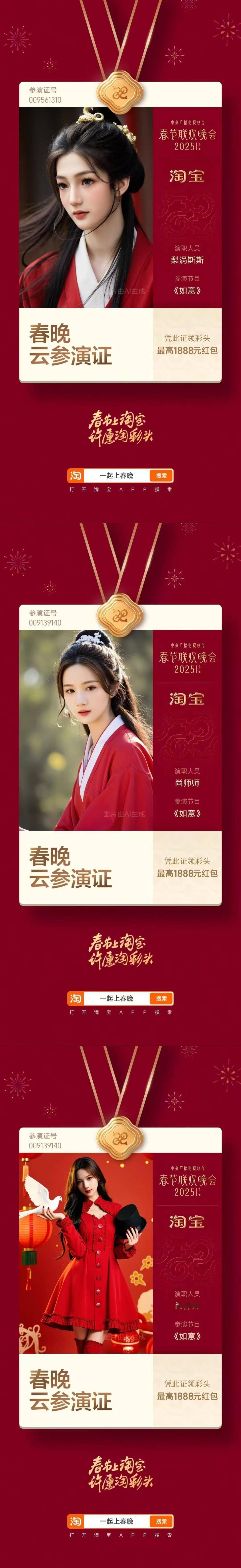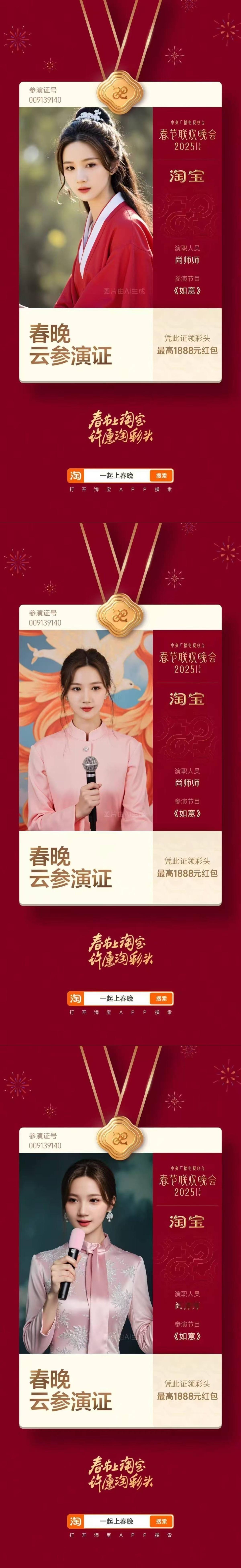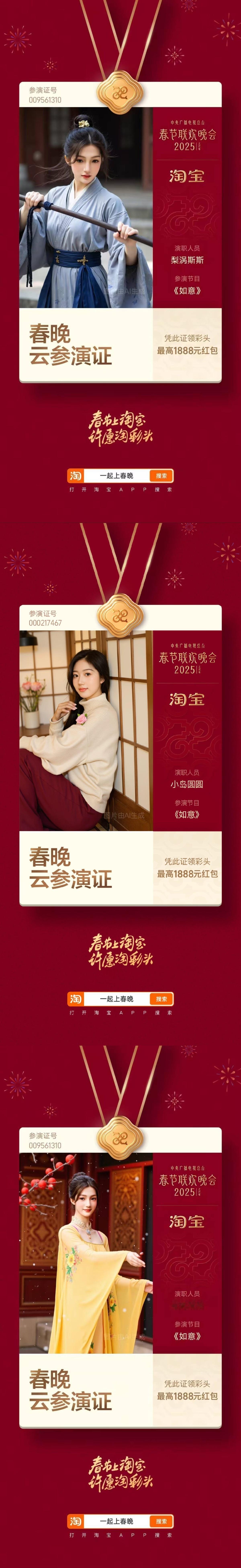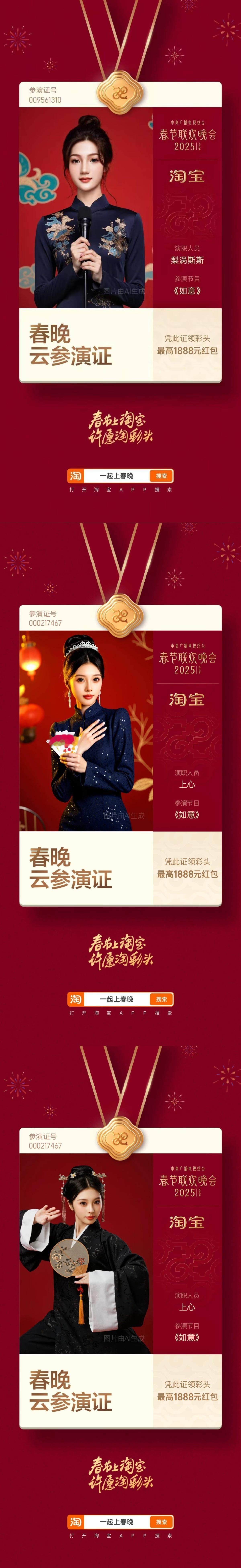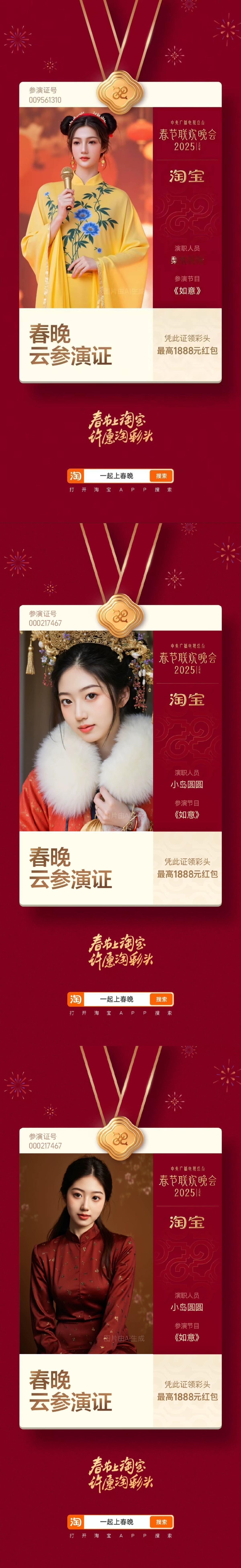 上淘宝领春晚云参演证 蛇年巳巳如意,给大家拜个早年!顺便带个关于春晚的好消息,即日起上🍑搜素【一起上春晚】,领取你的专属参演证 春晚云参演证 ,身份可以自己选择,而且拟合度很高哦~还能凭证在除夕夜晚瓜分25亿红包, 春晚喊你上淘宝领证 淘个好彩头 送给新一年的自己吧~