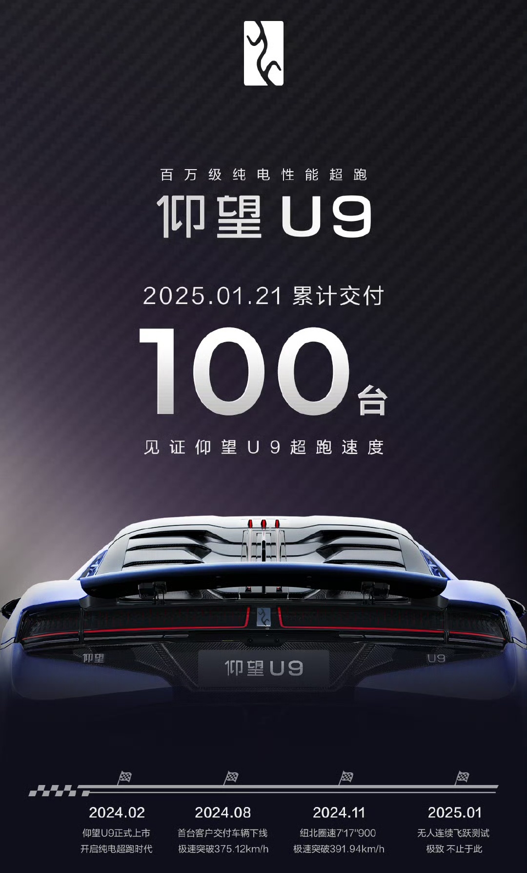 记得它是2024年2月份上市的,当时就被这台车的颜值惊艳到了。而最近仰望 U9迎来了百台交付,妥妥的里程碑成绩。这台电动超跑的性能这块也是杠杠的,综合功率高达960kW,峰值扭矩1680N·m,零百加速仅需2.36秒。0-400米加速更是非常恐怖,达到了9.78秒。底盘方面,它采用了800V高压平台和高集成主动力源云辇-X系统,功率达到了36kW,峰值单轴举升速率高达500mm/s,提供超过1吨的举升力。总的来说就是又稳又快。