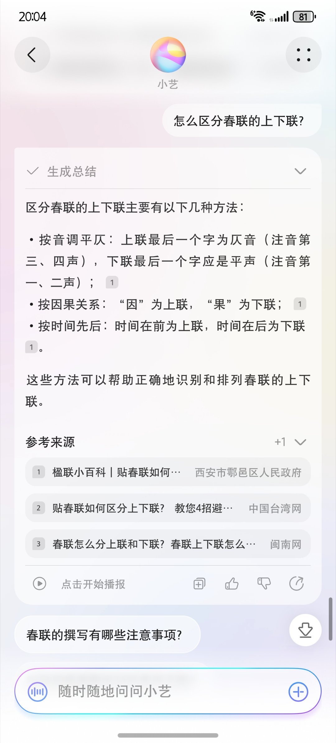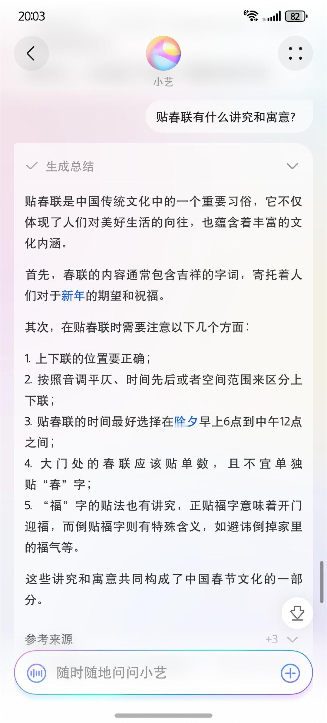 马上就要过年了,小艺还可以帮我们上传的正面照生成“春节写真”,并且有一些关于春节的知识也可以问它,像过年,小朋友们都放假了,有可能会问春节的由来,以及为什么要守岁等等问题,这个时候小艺就派上用场了,它可以一一解答。