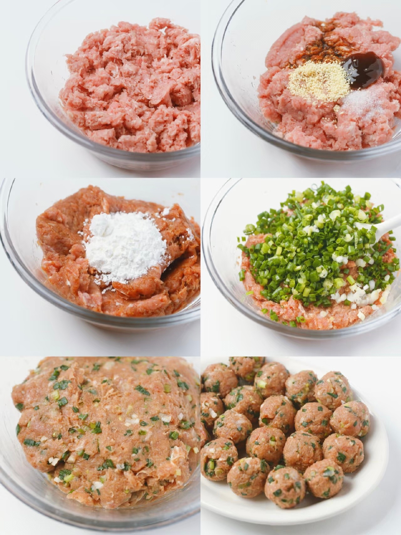 2️⃣调制肉馅:猪肉馅中加入姜末、葱花、生抽、老抽、盐、白胡椒粉和香油,朝一个方向搅拌至肉馅上劲,腌制15分钟。