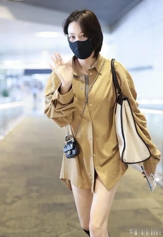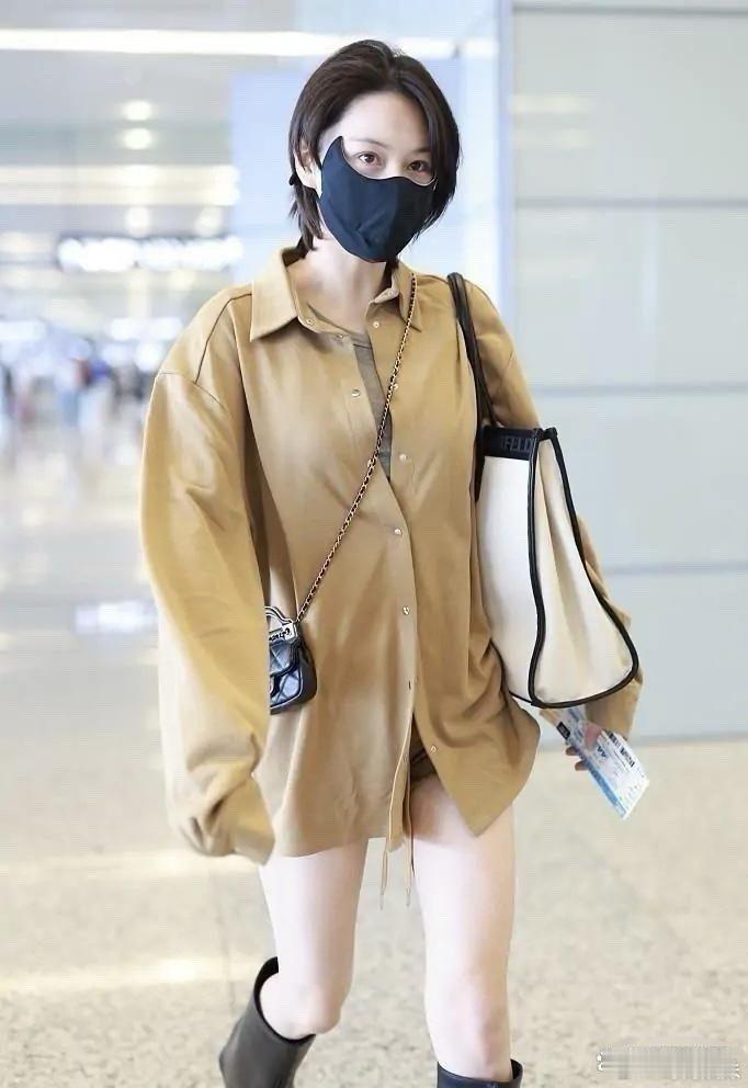 张馨予机场造型又玩“下衣失踪”!穿卡其色衬衫配长靴,短发惊艳撩人!