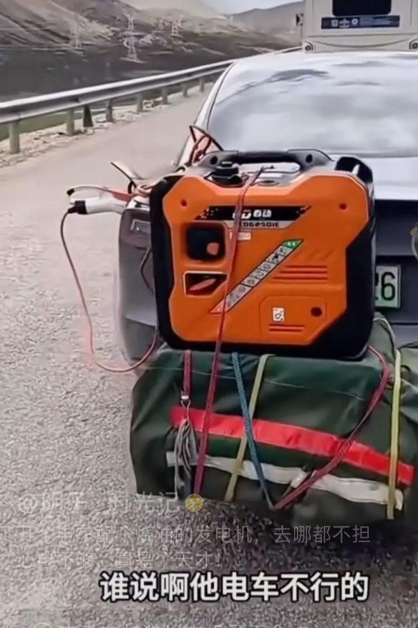 电动车续航里程不足,春节长假时又很难充电,你看看把车主们都逼成什么样子? 这辆特斯拉车主直接在车后加了一个发电机,并通过发电机充电的方式给特斯拉续命。 我之前推荐过这种方式,这种发动机的功率不大,1小时能充进3度电去就算了不起。 想要靠这种发电机实现长距离不间断续航肯定是不可能的。但车主安装这种发电机明显不是为了提高续航里程,而是为了应急使用。 假如春运时出现了严重堵车,燃油车车主可在车内开空调,但纯电动车主确实没这个胆子。可有了发电机之后,这一切都可迎刃而解。 网络上有不少卖这种发动机的,最便宜的才800块钱,贵的三五千块钱的也都有。如果你也担心春节长假会遇到难以充电问题,不妨也可以考虑备一个,就算是给自己买个保险吧。