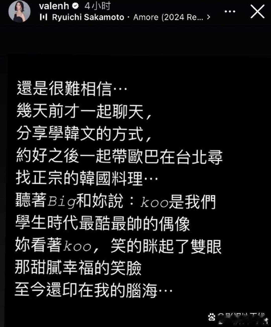 许茹芸发文悼念大S,称两人几天前还分享学韩语的方式,大S看具俊晔的笑脸甜腻幸福。