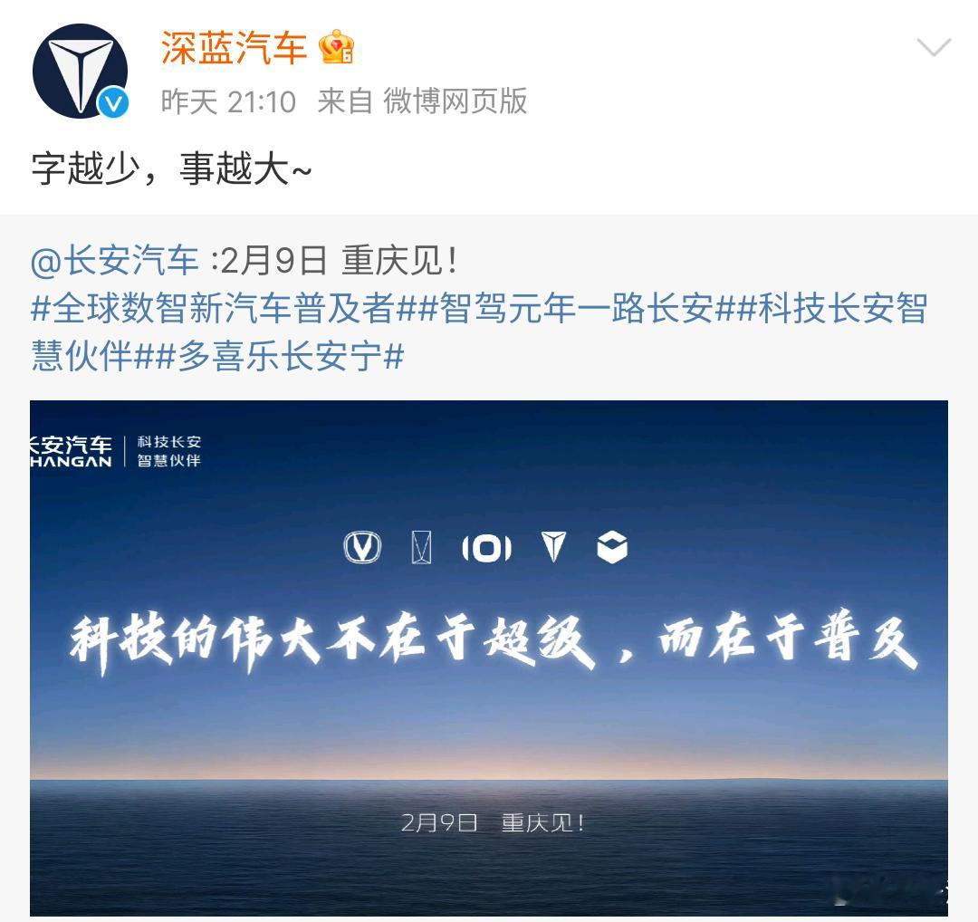 长安汽车春节后的第一场发布会就要来了,可真是字越少,事越大,期待一下[哇]