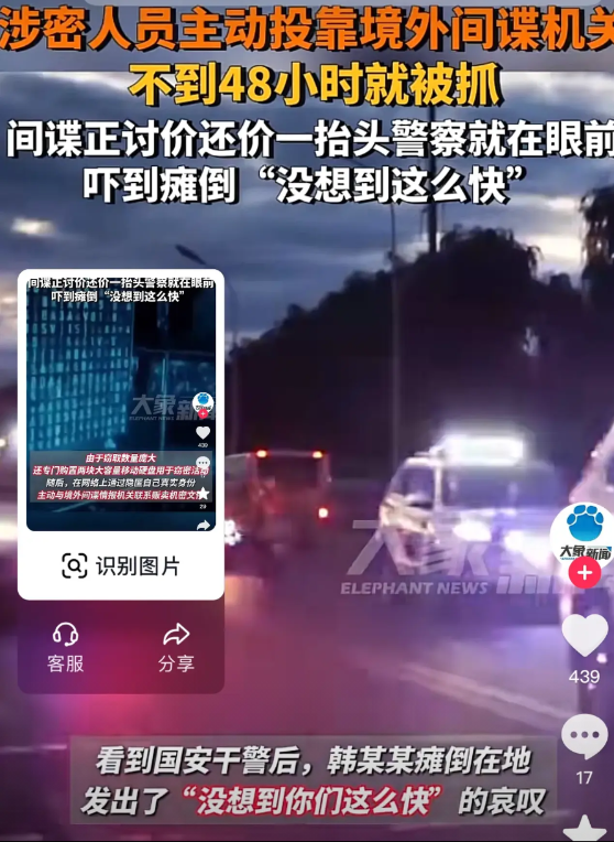 2月7日,据多家官媒报道,国家涉密工作人员韩某贪图享乐,主动联系国外间谍,出卖国家机密,在作案48小时内,被国安部门现场抓捕,他正在和间谍讨价还价的时候,抬头看到警察站在面前,吓得瘫坐在地说:没有想到你们这么快!