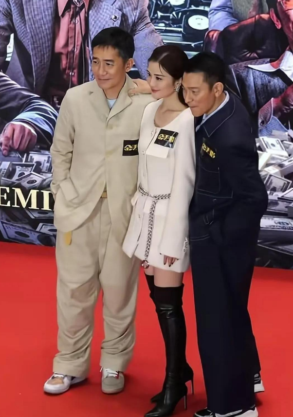 刘德华将手搭在梁朝伟肩上,蔡卓妍位于中间,刘德华的绅士风度展露无遗。这或许不单单是一种礼貌,更似是对角色关系的一种微妙演绎。在那个充斥着权力争斗与金钱纠葛的故事背景之下,角色间的互动细节颇值得玩味。 镜头拉近,梁朝伟的表情细微变化,嘴角一丝不易察觉的苦笑,似乎在回应刘德华的举动。 这苦笑里,包含着多少无奈和算计? 或许是多年商场沉浮的疲惫,又或许是对这场合作的隐忧。 蔡卓妍,夹在两人中间,眼神游移不定,像是揣摩着两位大佬之间的暗流涌动。 她的小动作,轻轻拨弄了一下耳边的碎发,更添了几分局促不安。