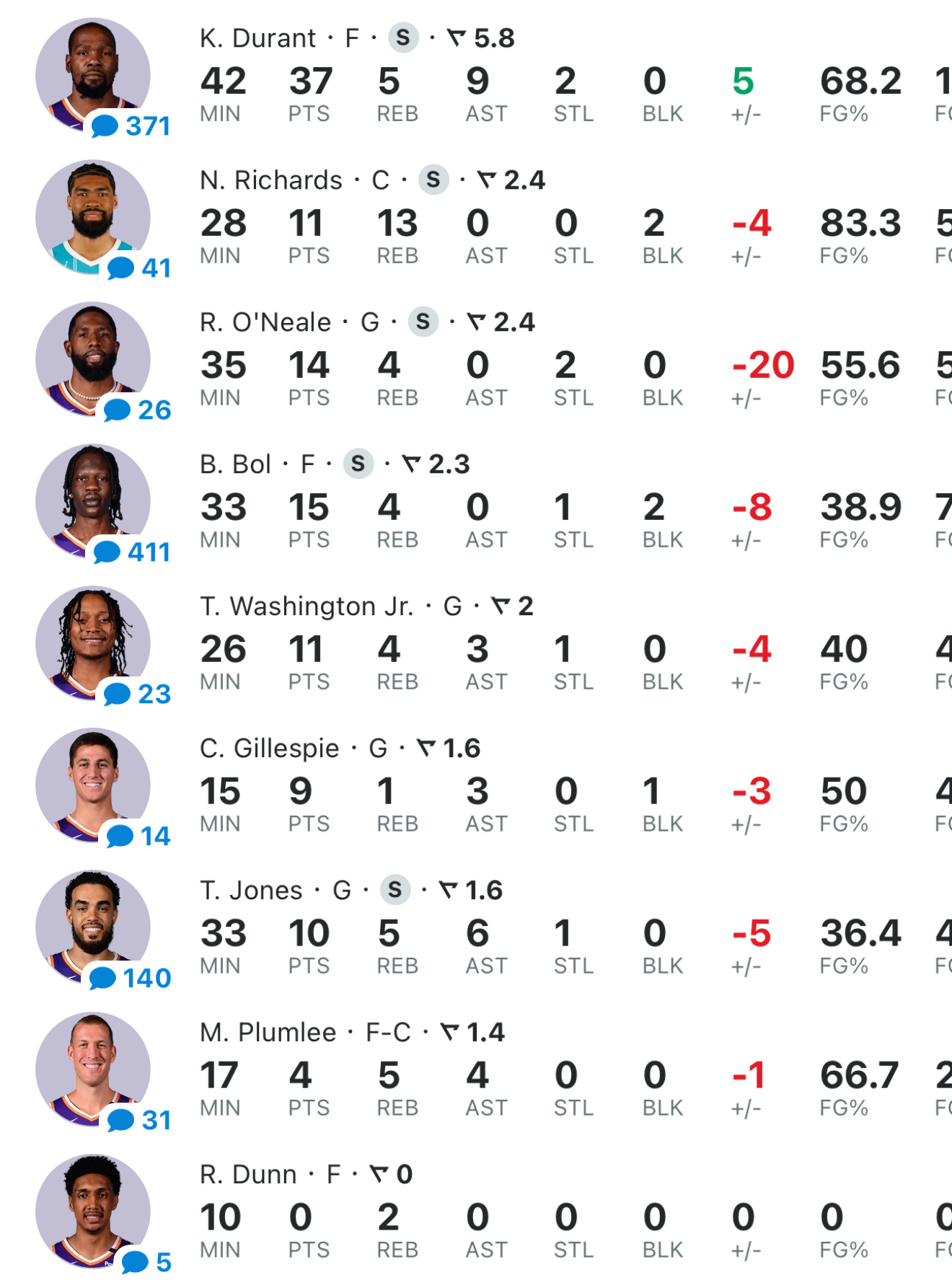 3万分先生杜兰特,伤愈复出后连续两场超负荷比赛,两场比赛打了85分钟,拿到71分和12次助攻。在输给火箭的比赛中,杜兰特是全队仅存一个正负值不是负数的人。太阳两连败,这个赛季别说争总冠军了,进附加赛都难。