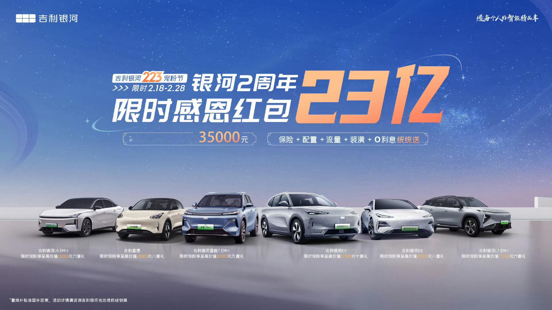 吉利银河2周年23亿宠粉 吉利银河2周岁了,这次拿出了23亿来宠粉,置换、保险、配置、装潢、0利息,都给安排到位。这波销量又要涨不少了[doge]
