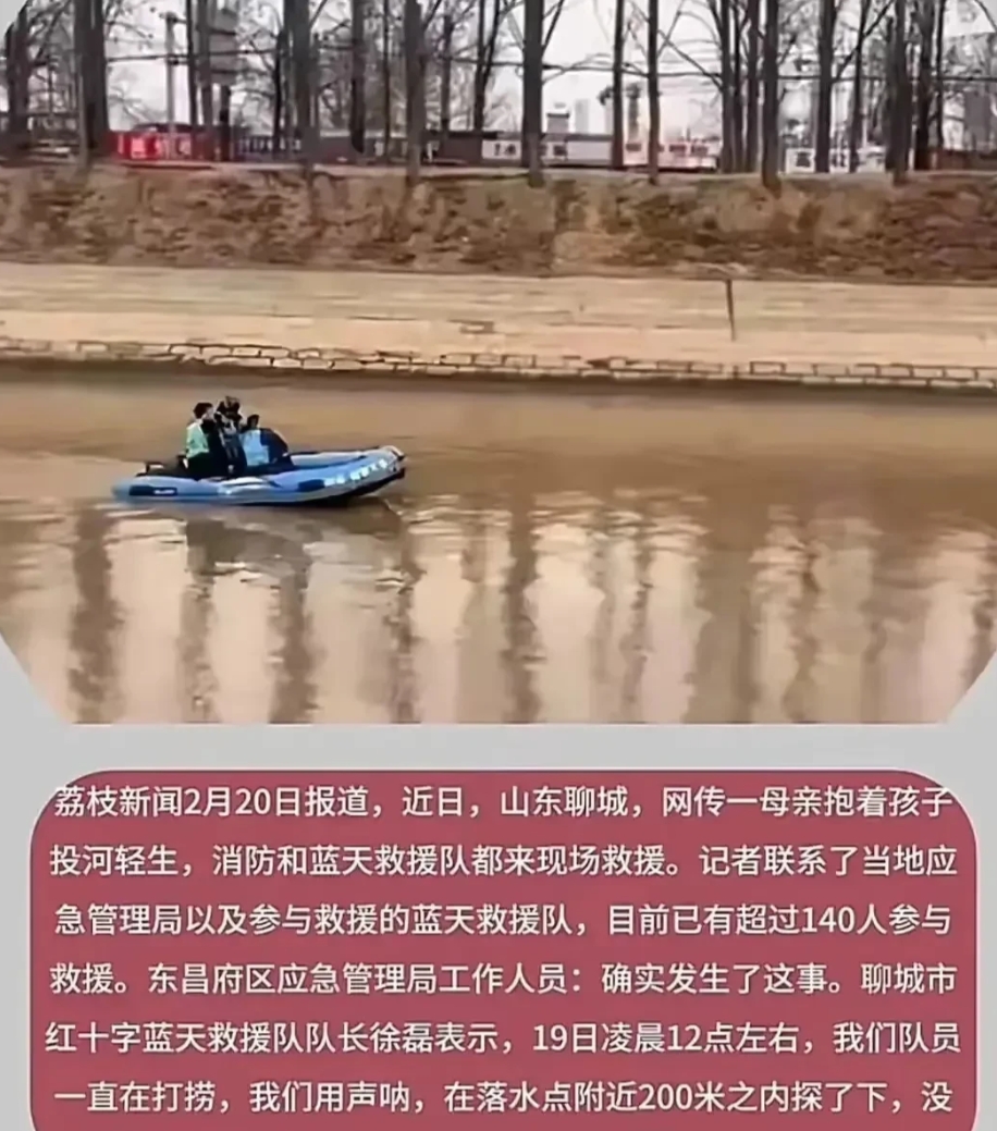 聊城跳河母女已经找到了,紧紧的绑在一起,根本就没想活。 2月20日凌晨40分,山东聊城女子带着两岁多的女儿跳河了。 至今已经两天了,经过消防和蓝天救援队的努力打捞,最终打捞出来了。 两人紧紧的绑在一起,根本就没给自己留活路。 有知情人透露,跳河女子与婆家关系并不好,女子是全职妈妈,丈夫一人上班挣钱,前段时间丈夫失业,没有了经济来源,每个月还要还4千多房贷,压力很大。 她婆婆还是个重男轻女的人,自从女子生个女孩,就从来没有好脸色。 事发当天夫妻俩有过争执,然后女子生气离家,最终想不开投河。 但是她丈夫从始至终都否认两人有争吵。 有人曾捡到女子留在河边的羽绒服和手机,她丈夫过去半天才打一个电话。 也许女子曾在河边徘徊过,毕竟她怀里抱着两岁的女儿,她怎么忍心呢? 也许她在等丈夫打电话哄她,但她一直都没等到,哪怕是为了孩子而哄她。 也许这才是压死骆驼的最后一根稻草。