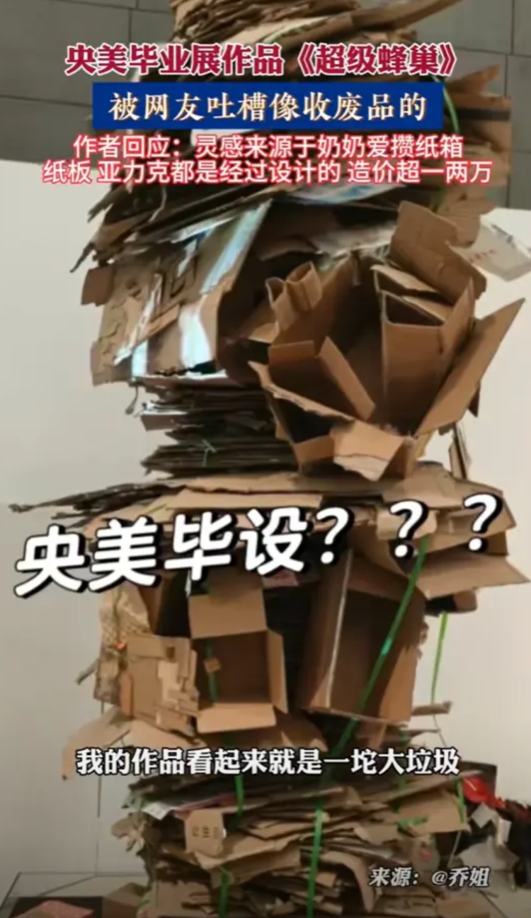 2024年5月,女生带着自己的作品《超级蜂巢》亮相了,结果却让人大失所望,像老奶奶堆的废纸壳,准备拉出去卖,在一众出色的作品中显得格外突出。