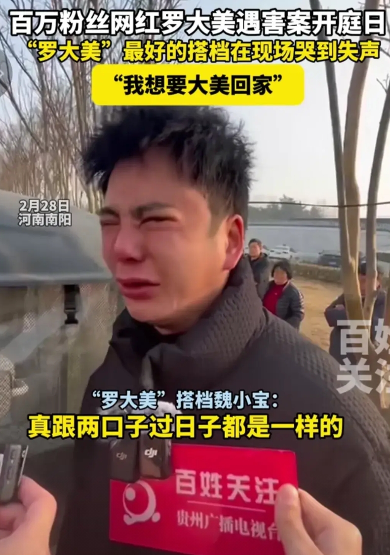 “我想要大美回家”昔日搭档痛不欲生,第一次公开面对!看哭了! 28日,在法庭外,罗大美生前最好的搭档,最好的朋友小宝,终于可以痛快的哭出来了!这是自罗大美遭遇不幸后,他第一次公开面对此事。 他们两个合作作品,被粉丝们依然珍藏着,小宝在视频中经常扮演罗大美的丈夫。 两个人亲密无间,每天为拍视频,商谈剧本天天联系,也是他最先发现罗大美联系异常,赶快通知大美家人,然后比较敏感的去交警队,查询无大美车辆车祸信息后,断定大美遭遇不测,随后报警。 而在确认大美遇难后,除了父母亲人,最痛苦伤心的就是他了。 而作为一个网红,他从没有在镜头前提起过罗大美,因为两人交情太深,就像小宝今天说的,他们两个相处的跟真两口子一样。 他不想去消费大美,不忍心伤害大美,即使他已经不在了。 他只能无数次独自痛哭,或是跟大美亲人一起流泪,在他随后的发出视频中,他从没有开心的笑过。 而今天,他终于在镜头前痛痛快快的哭了出来,好好释放了对大美的痛惜和思念。 他发自内心的那句“我想要大美回家”,看哭无数网友。 27日,大美的妈妈告诉媒体,大美的遗体至今仍停放在殡仪馆,而案发是在7月,正值盛夏,遗体情况可想而知。 小宝和大美家人,期盼着正义的来临,让凶手伏法,让大美可以入土为安。 大家都在期待着小宝以及大美家人带大宝回家!