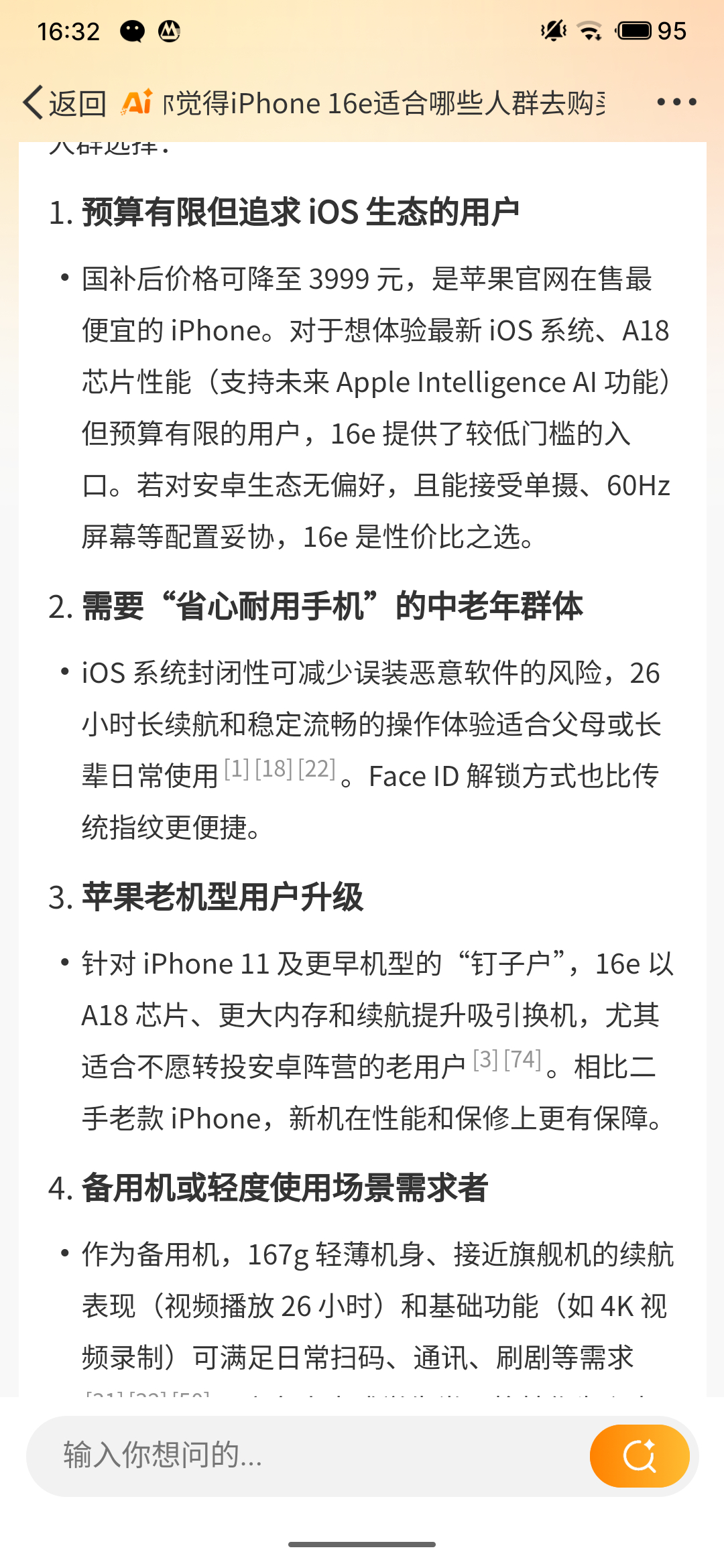 它的回答还是很中肯的,iPhone 16e定位于轻中度和预算用户,也就是说,虽然它搭载的是A18 处理器,但是游戏发烧友肯定是不推荐去购买。因为它这个价位段选择国产性能机体验肯定会更好。