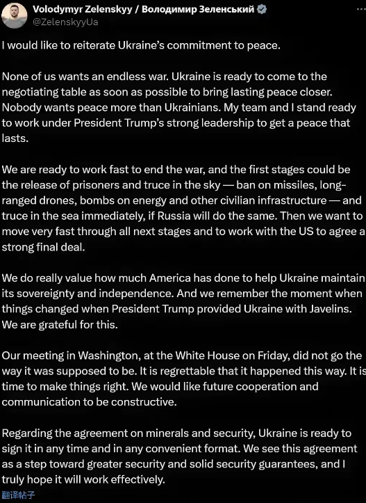 3月4日,泽连斯基在社交媒体发文,对他在白宫的争吵表示遗憾,是时候纠正错误并已准备好在特朗普总统强有力的领导下开展工作。