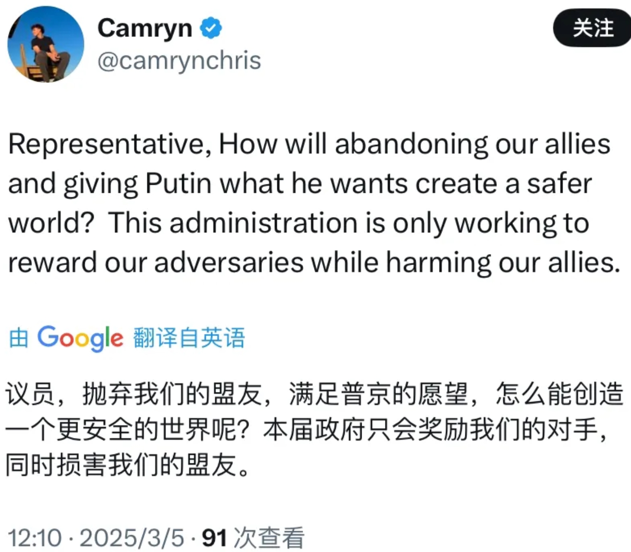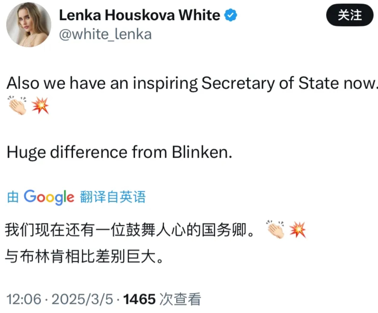 补充几句:在鲁比奥的帖文下面,夸奖特朗普和鲁比奥的居多,有的表示:“我们现在还有一位鼓舞人心的国务卿。与布林肯相比差别巨大。”(图三)但是有些美国网民也表达了不同观点。有的问到:“抛弃我们的盟友,满足普京的愿望,怎么能创造一个更安全的世界呢?本届政府只会奖励我们的对手,同时损害我们的盟友。”(图四)