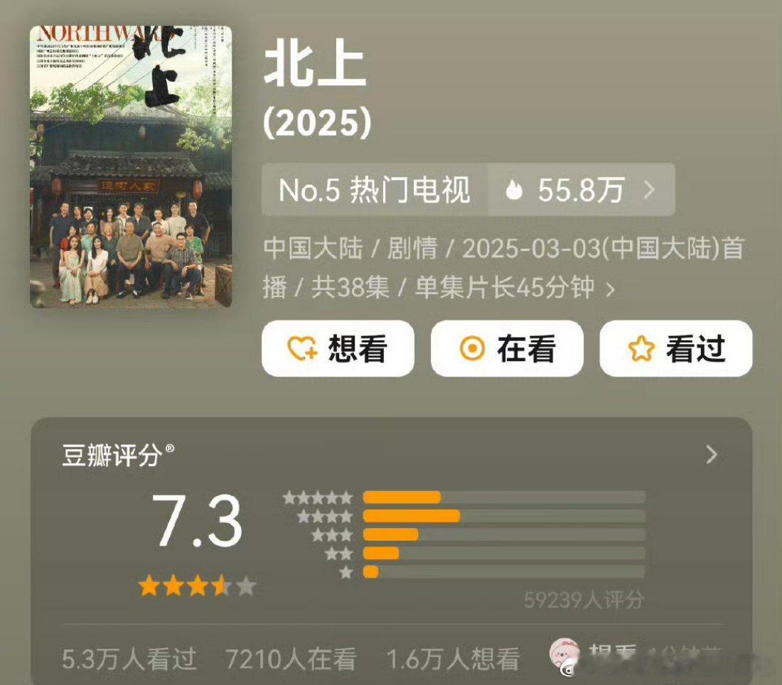 北上低了白鹿欧豪北上豆瓣开分7.3分,感觉以这部剧的质量来说有点低了,后面应该还会涨。