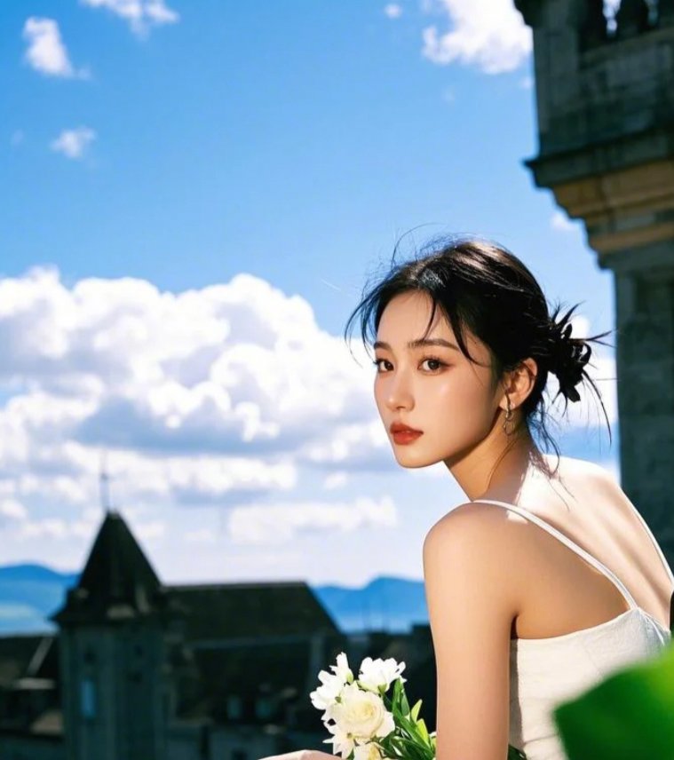 海风轻吻她的面颊,长发飘飘,T恤轻扬,画面浪漫而神秘