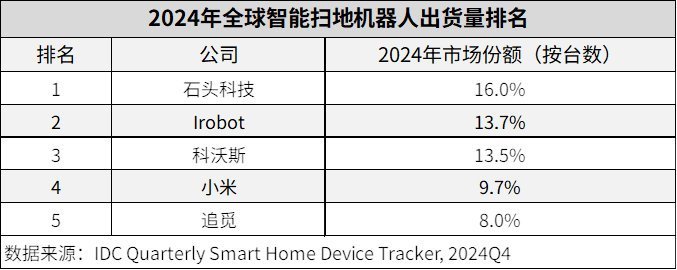 刚刚看到IDC宣布,2024年石头扫地机器人的销售额成功登顶全球第一。
