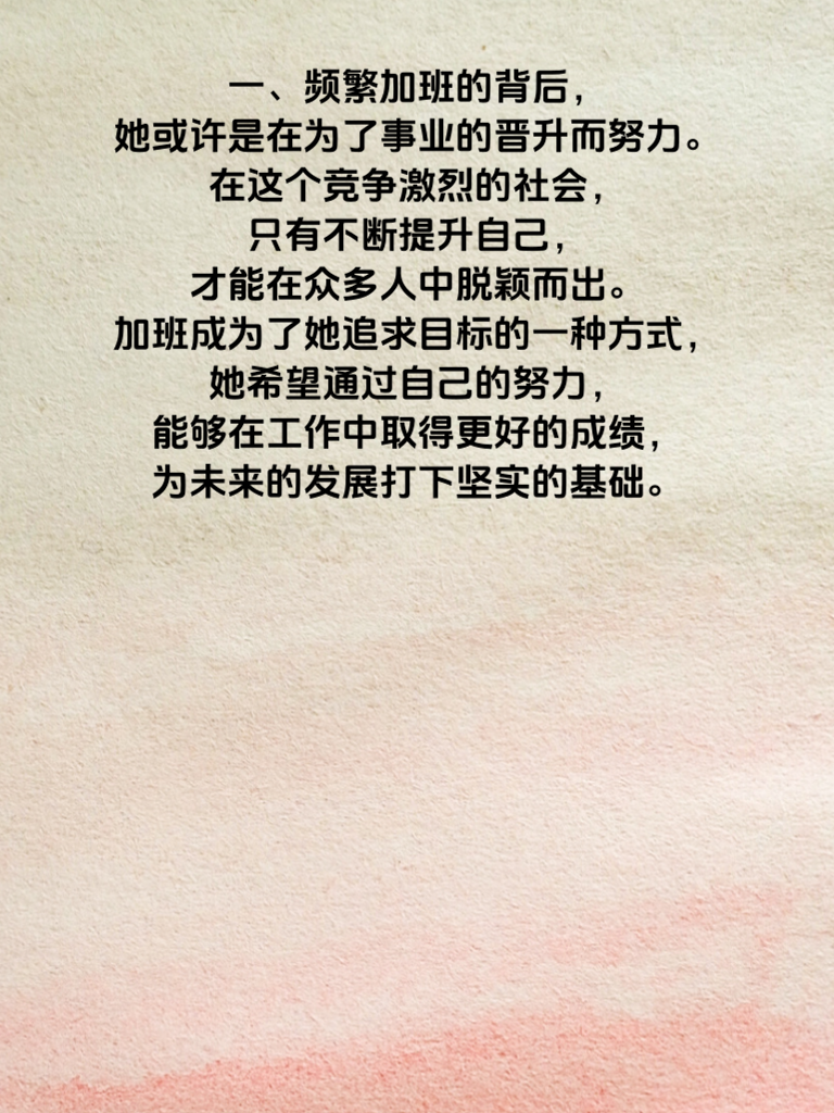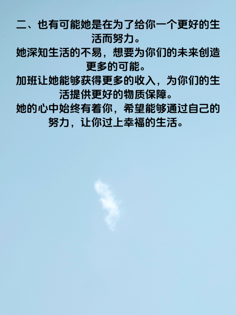 一、频繁加班的背后,她或许是在为了事业的晋升而努力。在这个竞争激烈的社会,只有不断提升自己,才能在众多人中脱颖而出。加班成为了她追求目标的一种方式,她希望通过自己的努力,能够在工作中取得更好的成绩,为未来的发展打下坚实的基础。 二、也有可能她是在为了给你一个更好的生活而努力。她深知生活的不易,想要为你们的未来创造更多的可能。加班让她能够获得更多的收入,为你们的生活提供更好的物质保障。她的心中始终有着你,希望能够通过自己的努力,让你过上幸福的生活。 三、还有一种可能是,她在加班的过程中,是在寻找自己的价值。在忙碌的工作中,她能够感受到自己的存在和意义,这种感觉让她感到满足和快乐。加班成为了她生活的一部分,她在其中找到了自己的价值和方向。 四、然而,频繁加班也可能给她带来一些压力和疲惫。作为她的伴侣,我们应该关心她的身体和心理健康,给予她更多的支持和理解。让她知道,无论她做出什么样的选择,我们都会一直陪伴在她的身边。