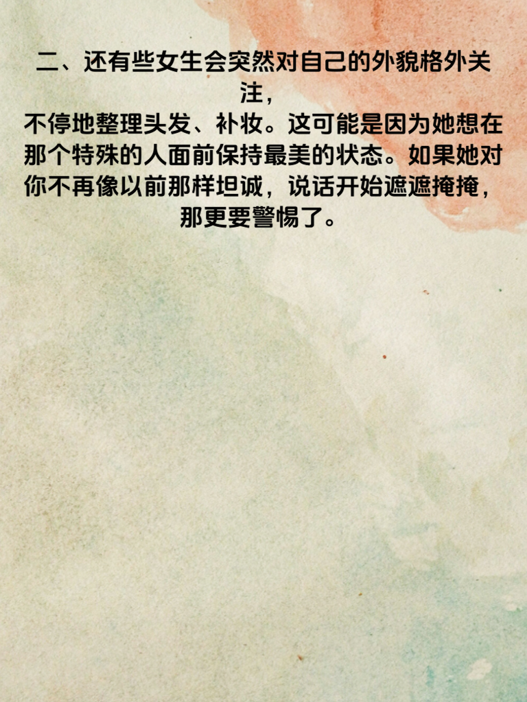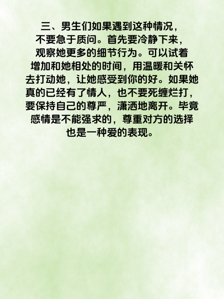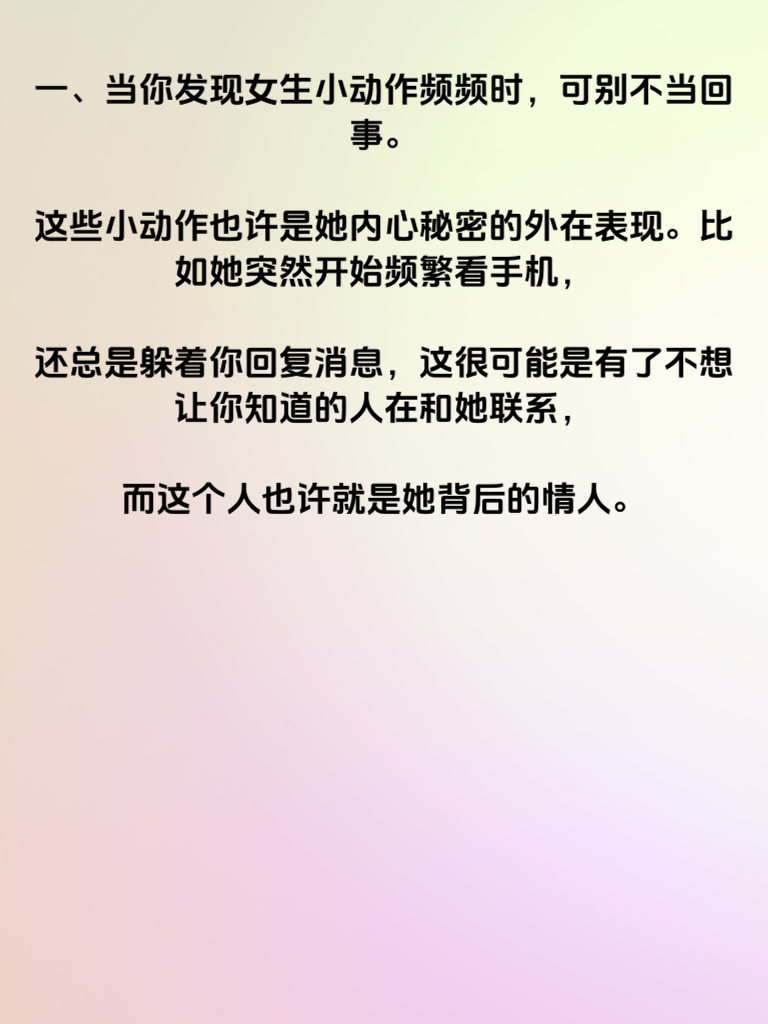 一、当你发现女生小动作频频时,可别不当回事。这些小动作也许是她内心秘密的外在表现。比如她突然开始频繁看手机,还总是躲着你回复消息,这很可能是有了不想让你知道的人在和她联系,而这个人也许就是她背后的情人。 二、还有些女生会突然对自己的外貌格外关注,不停地整理头发、补妆。这可能是因为她想在那个特殊的人面前保持最美的状态。如果她对你不再像以前那样坦诚,说话开始遮遮掩掩,那更要警惕了。 三、男生们如果遇到这种情况,不要急于质问。首先要冷静下来,观察她更多的细节行为。可以试着增加和她相处的时间,用温暖和关怀去打动她,让她感受到你的好。如果她真的已经有了情人,也不要死缠烂打,要保持自己的尊严,潇洒地离开。毕竟感情是不能强求的,尊重对方的选择也是一种爱的表现。