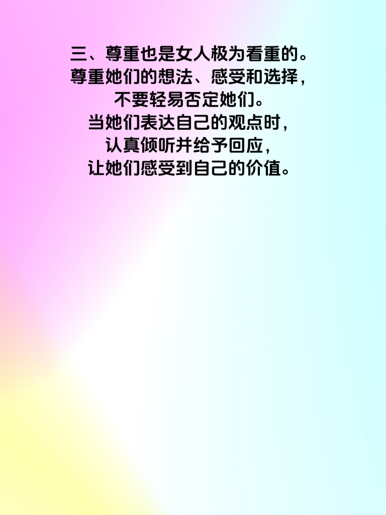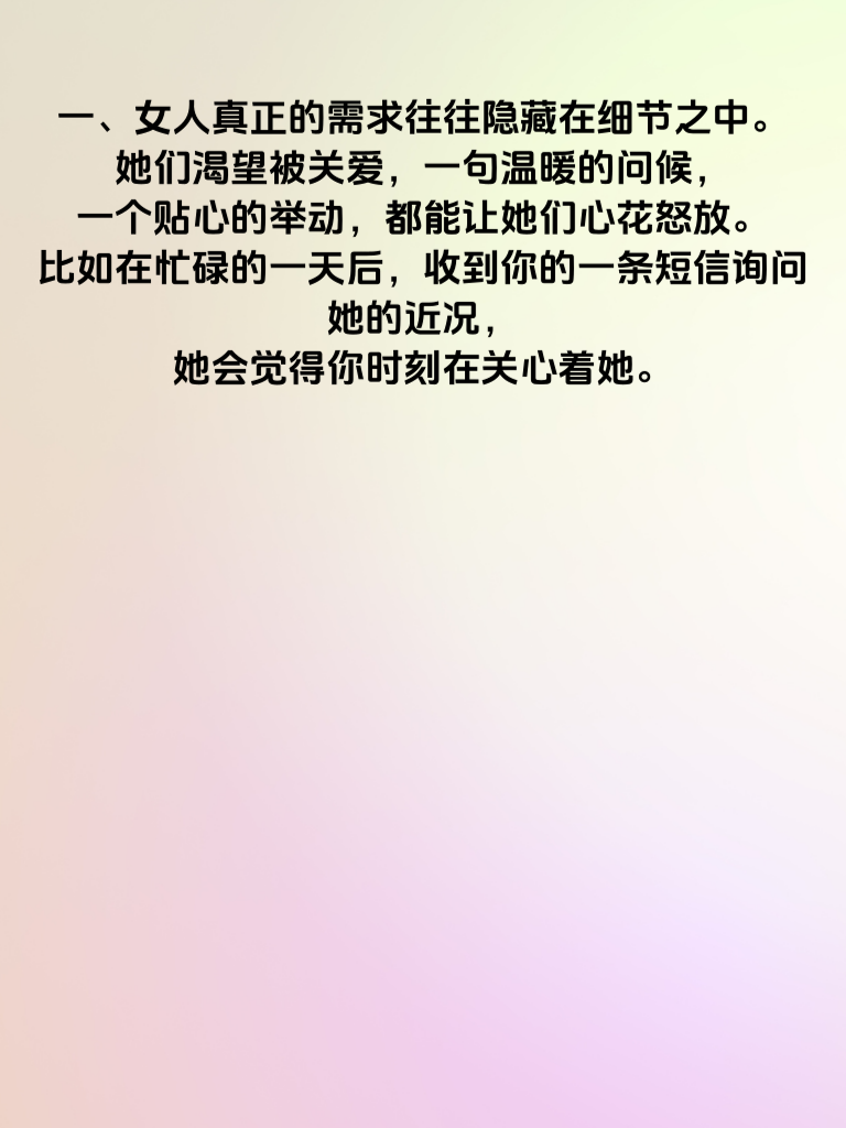 一、女人真正的需求往往隐藏在细节之中。她们渴望被关爱,一句温暖的问候,一个贴心的举动,都能让她们心花怒放。比如在忙碌的一天后,收到你的一条短信询问她的近况,她会觉得你时刻在关心着她。 二、安全感是女人不可或缺的需求。无论是物质上的保障还是情感上的依靠,都能让她们感到安心。在面对困难和挑战时,有你在身边给予支持和鼓励,她们会更加勇敢地去面对。 三、尊重也是女人极为看重的。尊重她们的想法、感受和选择,不要轻易否定她们。当她们表达自己的观点时,认真倾听并给予回应,让她们感受到自己的价值。 四、浪漫和惊喜能为女人的生活增添色彩。偶尔的一束鲜花、一次浪漫的晚餐或者一个特别的礼物,都能让她们感受到你的爱意和用心。