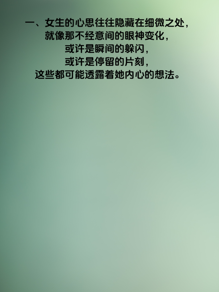 一、女生的心思往往隐藏在细微之处,就像那不经意间的眼神变化,或许是瞬间的躲闪,或许是停留的片刻,这些都可能透露着她内心的想法。 二、当她对你的态度突然变得有些冷淡,不再像从前那样热情洋溢,这可能是她内心在经历着某种挣扎,需要你去细心察觉。 三、她说话的语气也会透露出一些端倪,原本欢快的语调变得低沉,或者偶尔的停顿,都可能意味着她心中有了别样的情绪。 四、留意她的行为举止,比如突然开始整理自己的衣服,或者频繁地摆弄手中的物品,这些细微的动作也许是她在掩饰自己的不安或者期待。