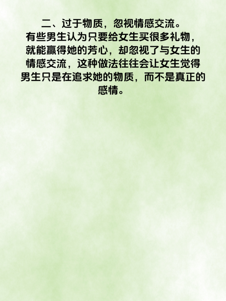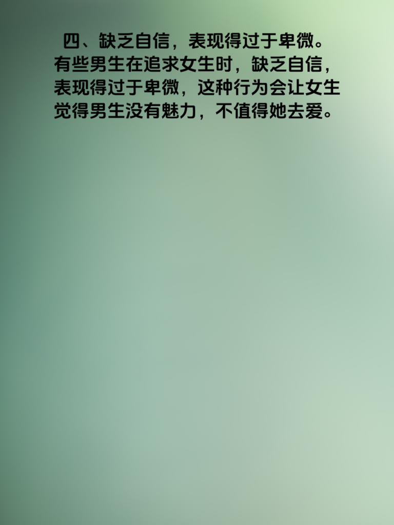 一、过度热情,让女生感到压力。有些男生在追求女生时,表现得过于热情,一天到晚不停地联系,甚至频繁约女生见面,这种过度的热情会让女生感到压力,产生逃避的心理。 二、过于物质,忽视情感交流。有些男生认为只要给女生买很多礼物,就能赢得她的芳心,却忽视了与女生的情感交流,这种做法往往会让女生觉得男生只是在追求她的物质,而不是真正的感情。 三、不尊重女生的意愿。有些男生在追求女生时,不尊重女生的意愿,强行要求女生做她不愿意做的事情,比如强迫女生接受他的礼物或者约会,这种行为会让女生感到被侵犯,从而对男生产生反感。 四、缺乏自信,表现得过于卑微。有些男生在追求女生时,缺乏自信,表现得过于卑微,这种行为会让女生觉得男生没有魅力,不值得她去爱。