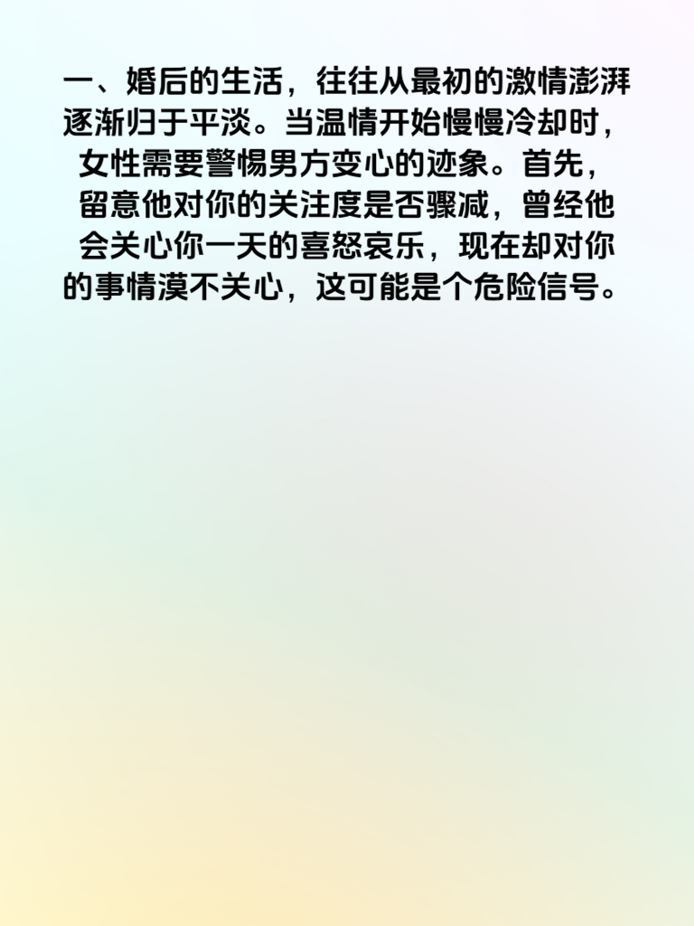一、婚后的生活,往往从最初的激情澎湃逐渐归于平淡。当温情开始慢慢冷却时,女性需要警惕男方变心的迹象。首先,留意他对你的关注度是否骤减,曾经他会关心你一天的喜怒哀乐,现在却对你的事情漠不关心,这可能是个危险信号。 二、他的社交活动也值得关注。如果他突然开始频繁参加一些没有你的聚会,或者对自己的手机、社交账号格外保密,这或许是他的心开始飘向别处的表现。在健康的婚姻关系中,夫妻间应该是坦诚相待的。 三、还有他对你的态度。以前他会包容你的小脾气,现在却变得不耐烦,经常为一点小事就和你争吵。这种态度的转变,很可能意味着他对这段婚姻的热情在减退。不过,这时候也不要慌张,要冷静地与他沟通,找出问题所在,也许还能挽回这段渐冷的感情。