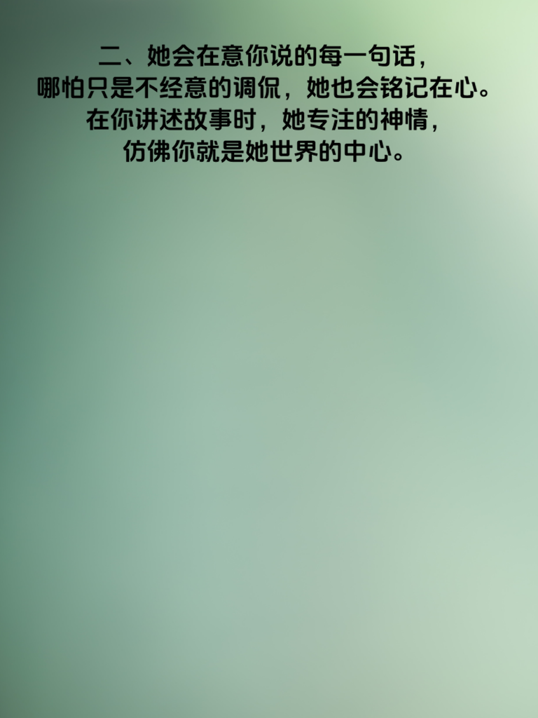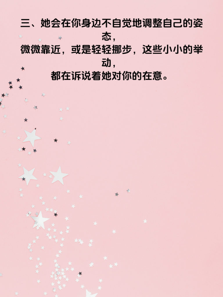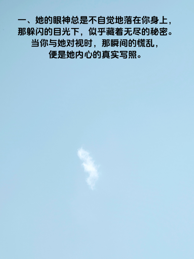 一、她的眼神总是不自觉地落在你身上,那躲闪的目光下,似乎藏着无尽的秘密。当你与她对视时,那瞬间的慌乱,便是她内心的真实写照。 二、她会在意你说的每一句话,哪怕只是不经意的调侃,她也会铭记在心。在你讲述故事时,她专注的神情,仿佛你就是她世界的中心。 三、她会在你身边不自觉地调整自己的姿态,微微靠近,或是轻轻挪步,这些小小的举动,都在诉说着她对你的在意。 四、当你遇到困难时,她会默默地关心你,或许只是一个关切的眼神,或者一句轻声的问候,却能让你感受到她内心的温暖。