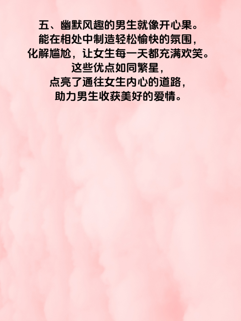 一、在爱情的世界里,每个女生都渴望找到那个有着诸多闪光点的男生。那么,男生究竟有哪些优点能让人心动不已呢?首先,真诚是必杀技。真诚的男生就像清澈见底的湖水,没有丝毫杂质。他们对待感情坦诚,不玩虚的,会让女生感受到被尊重和信任。 二、有责任心的男生也极具魅力。当遇到问题时,他们不会逃避,而是勇敢地承担起应尽的责任。无论是生活中的琐事,还是感情里的波折,都能坚定地站在女生身边,给予她依靠。 三、懂得倾听的男生更是贴心。女生倾诉烦恼时,他会耐心聆听,不打断、不敷衍。用理解的眼神和温暖的回应,让女生知道自己不是孤单一人面对困难。 四、有上进心的男生充满活力。他们为了未来努力拼搏,这种积极向上的态度会感染女生,让两人一起朝着美好的生活迈进。 五、幽默风趣的男生就像开心果。能在相处中制造轻松愉快的氛围,化解尴尬,让女生每一天都充满欢笑。这些优点如同繁星,点亮了通往女生内心的道路,助力男生收获美好的爱情。