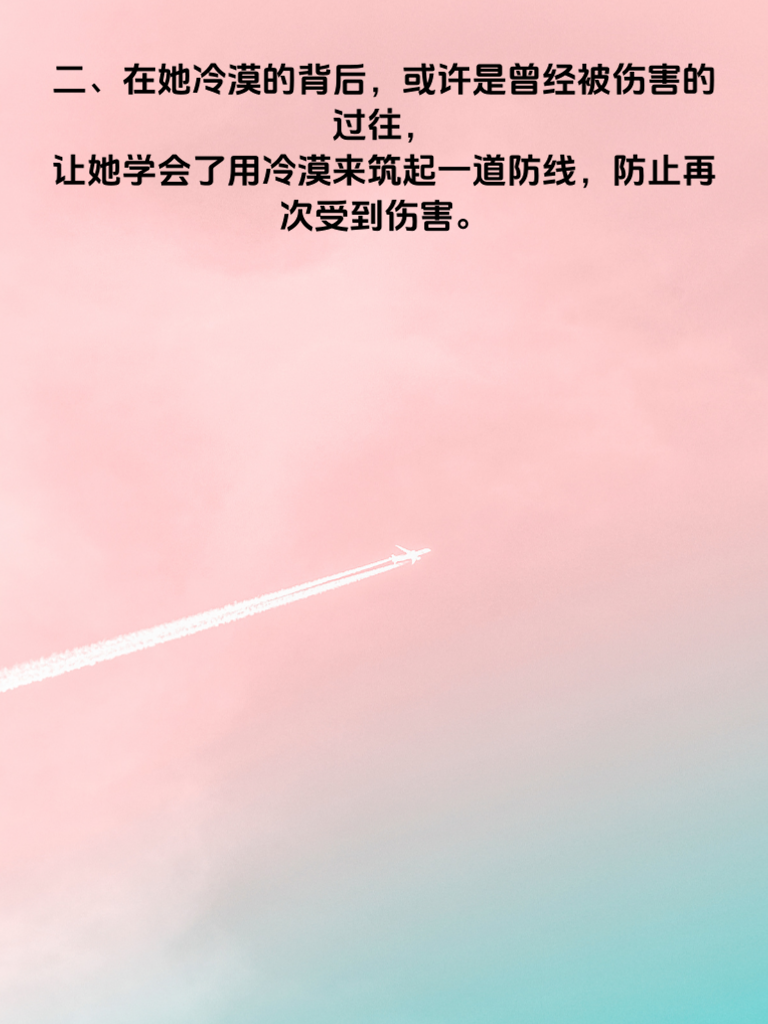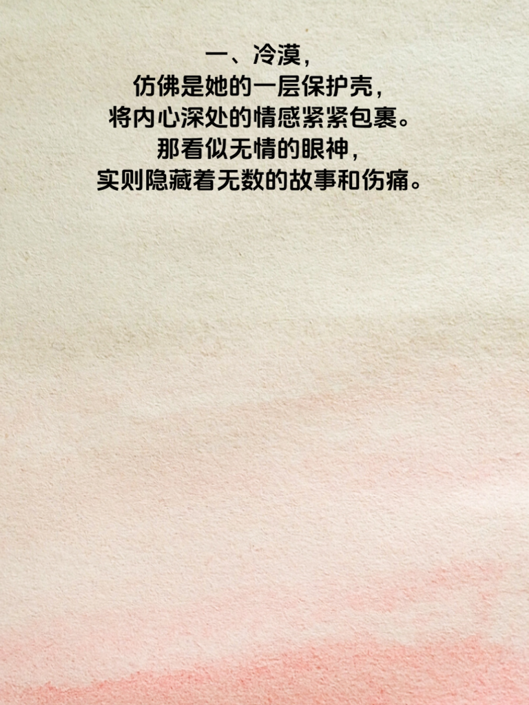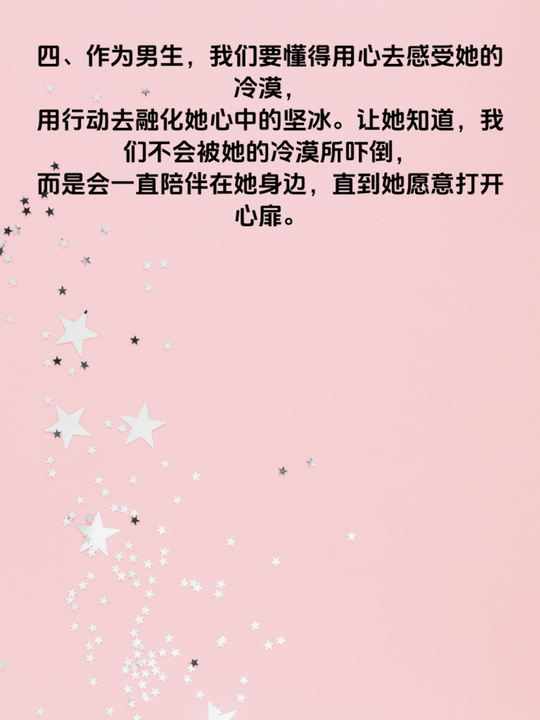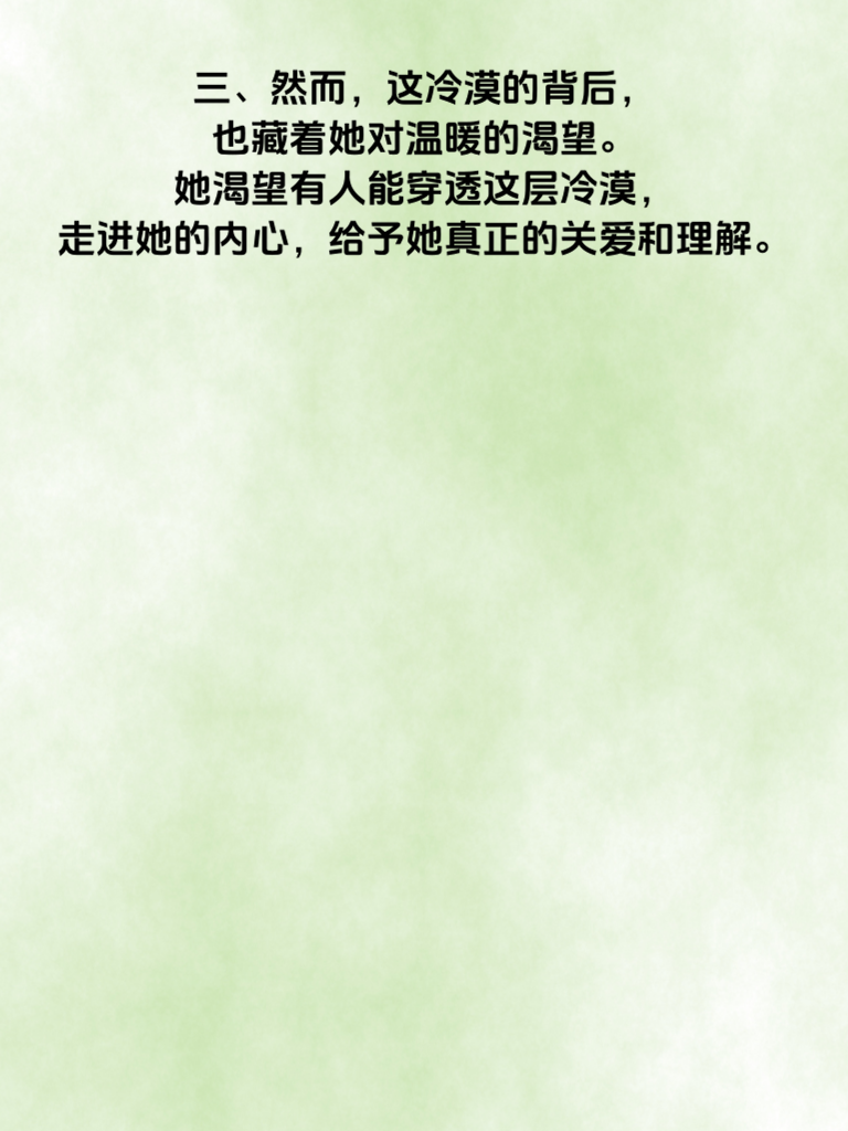 一、冷漠,仿佛是她的一层保护壳,将内心深处的情感紧紧包裹。那看似无情的眼神,实则隐藏着无数的故事和伤痛。 二、在她冷漠的背后,或许是曾经被伤害的过往,让她学会了用冷漠来筑起一道防线,防止再次受到伤害。 三、然而,这冷漠的背后,也藏着她对温暖的渴望。她渴望有人能穿透这层冷漠,走进她的内心,给予她真正的关爱和理解。 四、作为男生,我们要懂得用心去感受她的冷漠,用行动去融化她心中的坚冰。让她知道,我们不会被她的冷漠所吓倒,而是会一直陪伴在她身边,直到她愿意打开心扉。