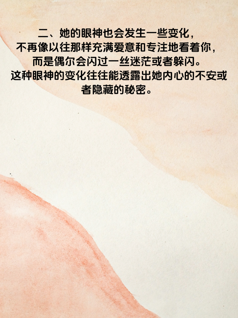 一、当她开始对你的行踪表现出过度的不在意,不再像以前那样频繁询问你的去向,这可能是一个微妙的变化。她或许不再像从前那样关心你的生活细节,对你的事情渐渐失去了兴趣。 二、她的眼神也会发生一些变化,不再像以往那样充满爱意和专注地看着你,而是偶尔会闪过一丝迷茫或者躲闪。这种眼神的变化往往能透露出她内心的不安或者隐藏的秘密。 三、她的行为举止也可能会有所不同,比如突然开始频繁地加班、参加各种社交活动,而这些活动以前她并不会那么积极。她可能是在寻找某种寄托或者逃避与你之间的问题。 四、如果她开始对你们之间的亲密接触变得抗拒,比如拒绝拥抱、亲吻等,这也是一个值得警惕的信号。她的身体语言往往能真实地反映出她的内心想法。