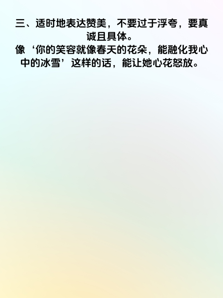 一、情话要有细节,比如回忆初次见面的场景,描述她当时的穿着和表情,让她感受到你对她的关注。比如:‘还记得第一次见你,你穿着那件白色的连衣裙,眼神中透露出一丝羞涩,那一刻,我就知道你是我生命中的特别存在。’ 二、用幽默的方式表达爱意,不要太严肃,让她在轻松的氛围中感受到你的心意。例如:‘你知道吗?你就像我生命中的一颗小太阳,每天都能让我开心到冒泡,要是没有你,我都不知道该怎么活啦!’ 三、适时地表达赞美,不要过于浮夸,要真诚且具体。像‘你的笑容就像春天的花朵,能融化我心中的冰雪’这样的话,能让她心花怒放。 四、在重要的日子送上特别的情话,比如生日、纪念日等,让她感受到你的用心。比如‘亲爱的,在这个特别的日子里,我想告诉你,你是我这辈子最珍贵的宝藏,愿我们的爱永远如初。