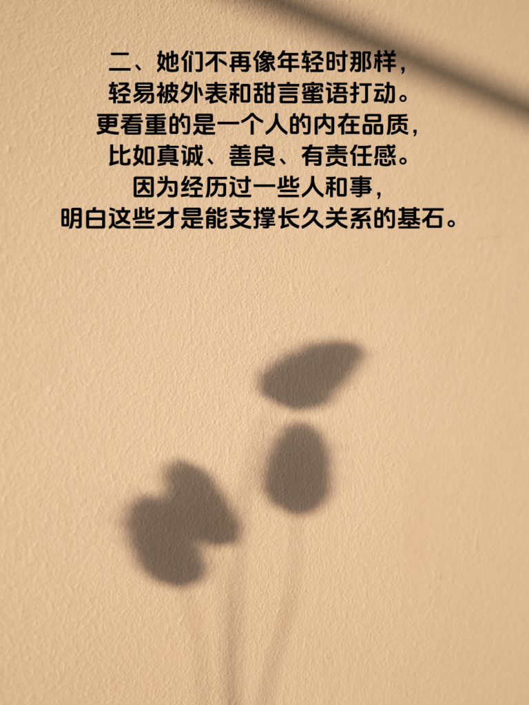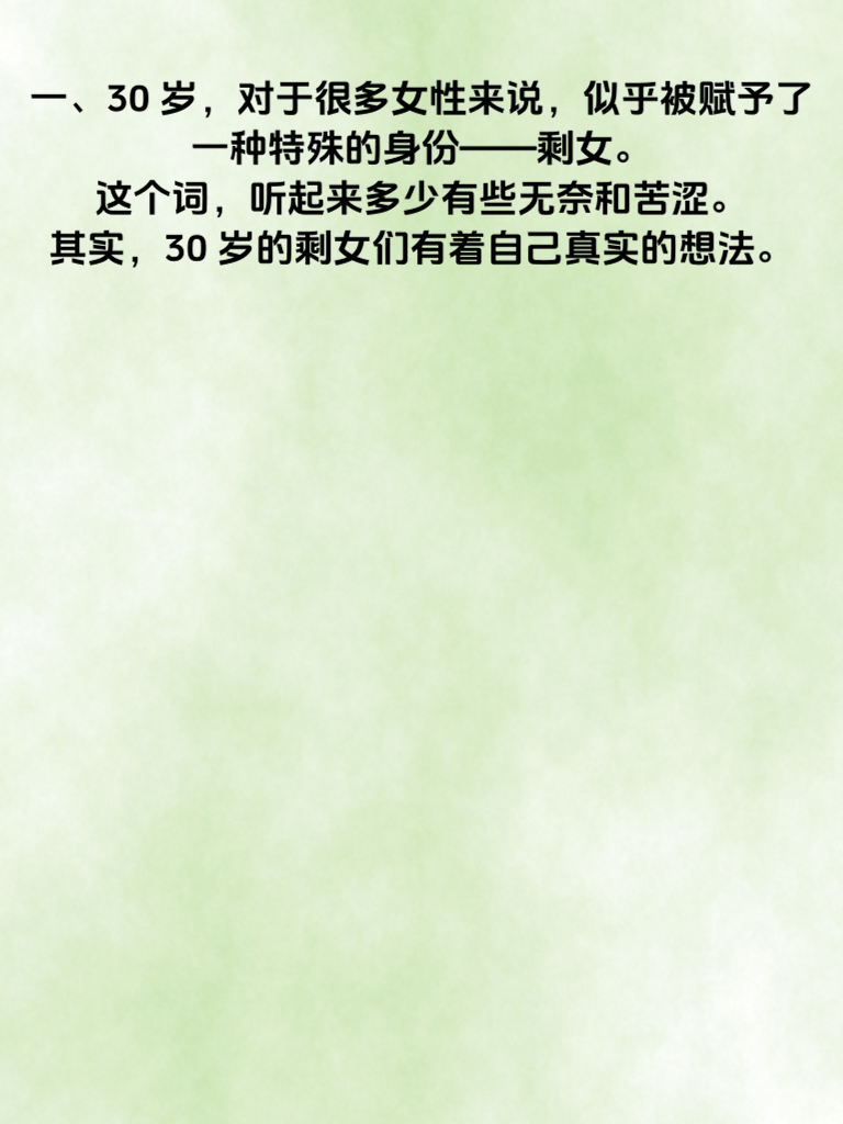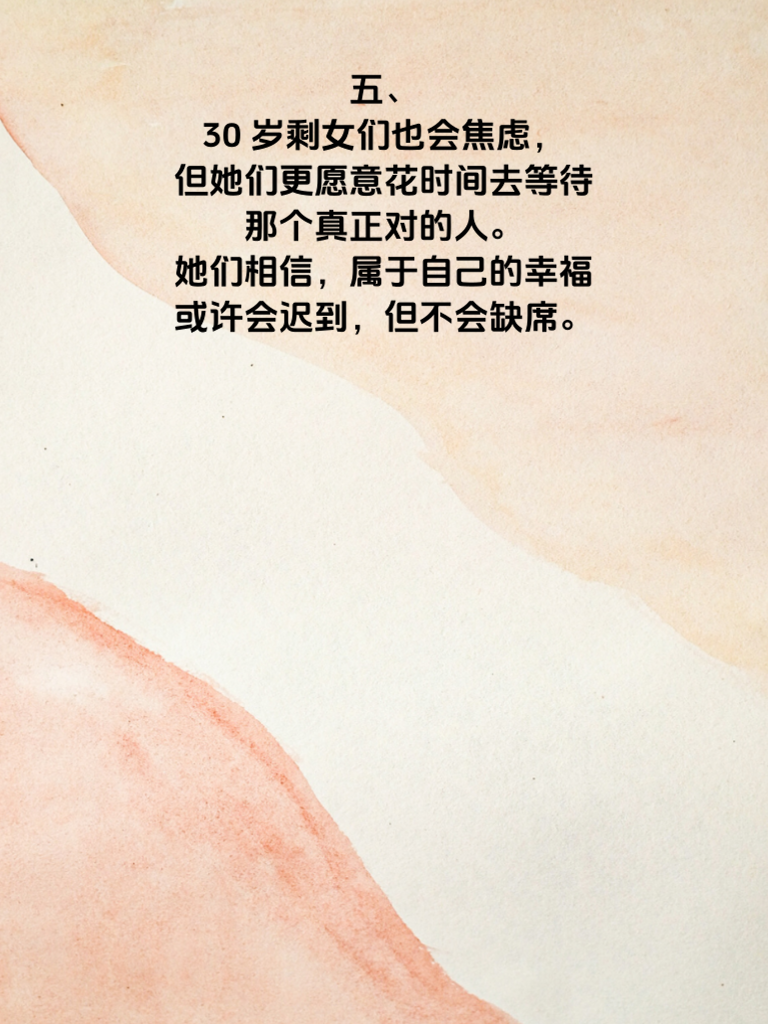 一、30 岁,对于很多女性来说,似乎被赋予了一种特殊的身份——剩女。这个词,听起来多少有些无奈和苦涩。其实,30 岁的剩女们有着自己真实的想法。 二、她们不再像年轻时那样,轻易被外表和甜言蜜语打动。更看重的是一个人的内在品质,比如真诚、善良、有责任感。因为经历过一些人和事,明白这些才是能支撑长久关系的基石。 三、在事业上有所追求的她们,也希望另一半能有自己的目标和规划。两个人可以相互支持,共同成长,而不是一方过度依赖另一方。 四、她们渴望的爱情是平等且相互尊重的。不希望在感情里委曲求全,而是能和对方坦诚沟通,分享生活中的喜怒哀乐。 五、30 岁剩女们也会焦虑,但她们更愿意花时间去等待那个真正对的人。她们相信,属于自己的幸福或许会迟到,但不会缺席。