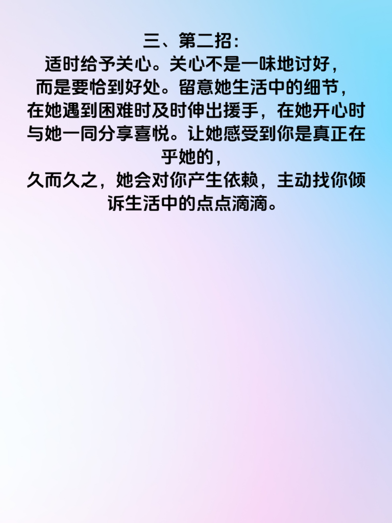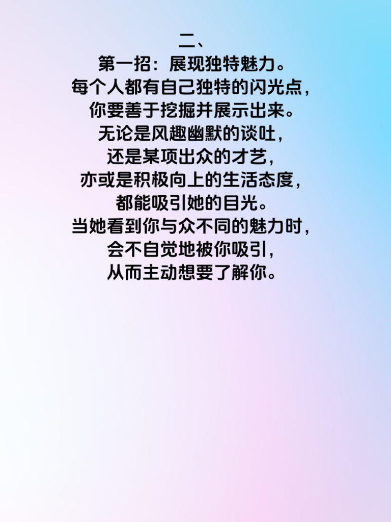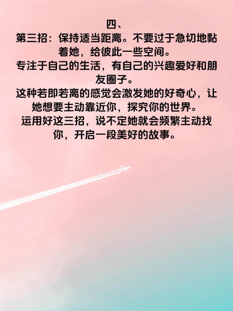 一、男人必知:这3招让她主动找你。在追求女生的道路上,掌握一些实用技巧能让你事半功倍。 二、第一招:展现独特魅力。每个人都有自己独特的闪光点,你要善于挖掘并展示出来。无论是风趣幽默的谈吐,还是某项出众的才艺,亦或是积极向上的生活态度,都能吸引她的目光。当她看到你与众不同的魅力时,会不自觉地被你吸引,从而主动想要了解你。 三、第二招:适时给予关心。关心不是一味地讨好,而是要恰到好处。留意她生活中的细节,在她遇到困难时及时伸出援手,在她开心时与她一同分享喜悦。让她感受到你是真正在乎她的,久而久之,她会对你产生依赖,主动找你倾诉生活中的点点滴滴。 四、第三招:保持适当距离。不要过于急切地黏着她,给彼此一些空间。专注于自己的生活,有自己的兴趣爱好和朋友圈子。这种若即若离的感觉会激发她的好奇心,让她想要主动靠近你,探究你的世界。运用好这三招,说不定她就会频繁主动找你,开启一段美好的故事