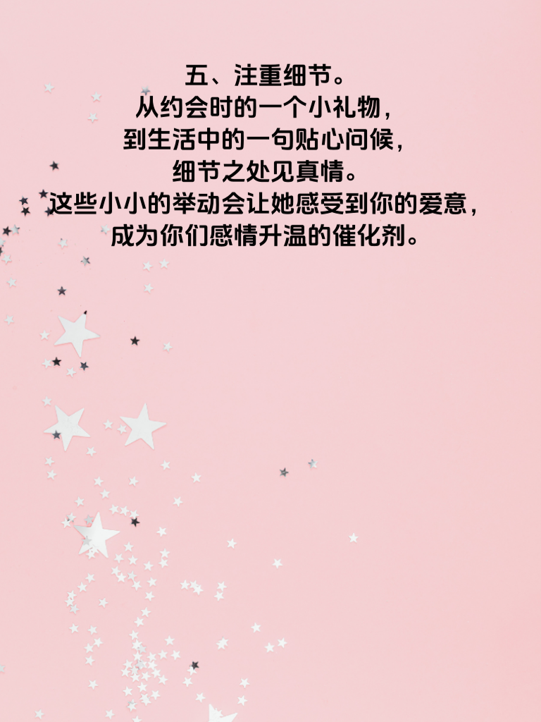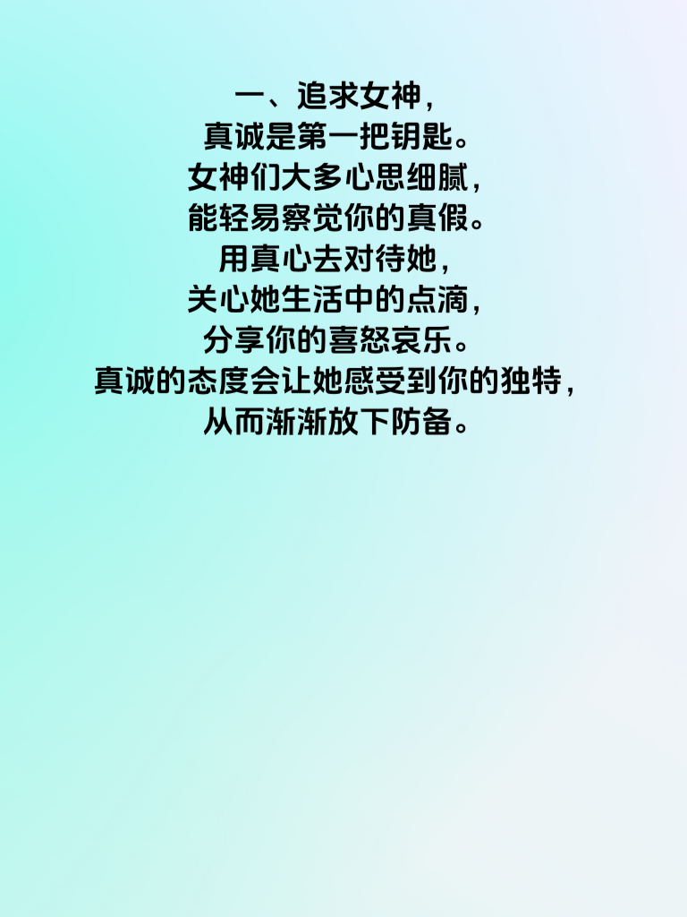 一、追求女神,真诚是第一把钥匙。女神们大多心思细腻,能轻易察觉你的真假。用真心去对待她,关心她生活中的点滴,分享你的喜怒哀乐。真诚的态度会让她感受到你的独特,从而渐渐放下防备。 二、了解她的喜好至关重要。花时间去探寻她的兴趣爱好,无论是喜欢的电影、音乐,还是热爱的运动。当你和她交流这些话题时,她会惊喜于你对她的用心,你们的距离也会在不知不觉中拉近。 三、保持自信的姿态。自信的男生在女神眼中极具魅力。不要因为她的优秀而自卑,相信自己的闪光点。大方地展示自己的才华和优点,让她看到你的魅力,这样才能吸引她的目光。 四、尊重她的想法和选择。在相处中,尊重她的意见,不强行灌输自己的观点。当她感受到被尊重,会更愿意和你深入交流,也会对你产生更多好感。 五、注重细节。从约会时的一个小礼物,到生活中的一句贴心问候,细节之处见真情。这些小小的举动会让她感受到你的爱意,成为你们感情升温的催化剂。