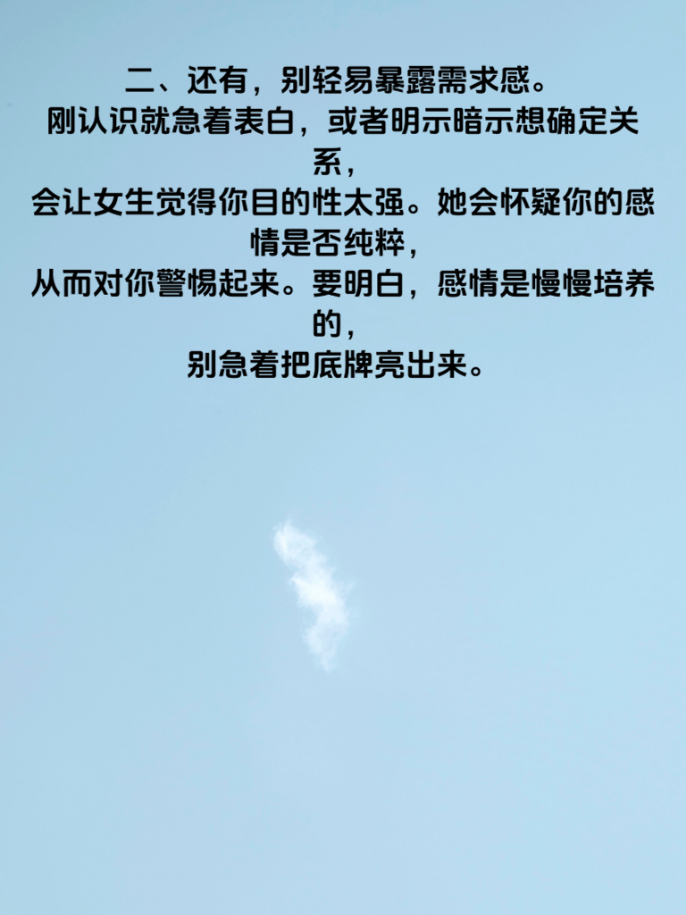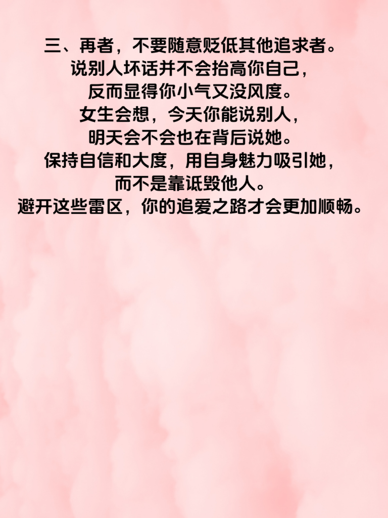 一、追女生时,有些雷区千万碰不得。首当其冲的就是过度纠缠。很多男生觉得频繁联系能刷存在感,可这往往适得其反。女生会感到压力巨大,对你避而远之。比如一天发无数条消息,对方不回还不停发,这绝非良策。 二、还有,别轻易暴露需求感。刚认识就急着表白,或者明示暗示想确定关系,会让女生觉得你目的性太强。她会怀疑你的感情是否纯粹,从而对你警惕起来。要明白,感情是慢慢培养的,别急着把底牌亮出来。 三、再者,不要随意贬低其他追求者。说别人坏话并不会抬高你自己,反而显得你小气又没风度。女生会想,今天你能说别人,明天会不会也在背后说她。保持自信和大度,用自身魅力吸引她,而不是靠诋毁他人。避开这些雷区,你的追爱之路才会更加顺畅。