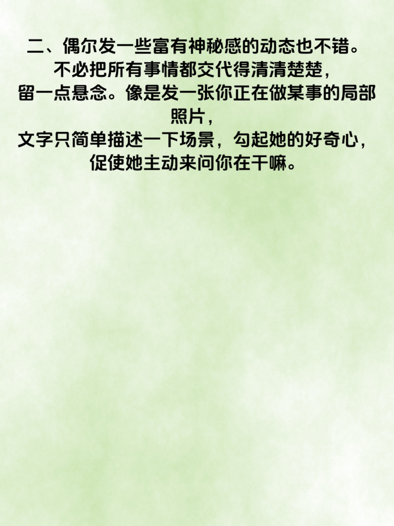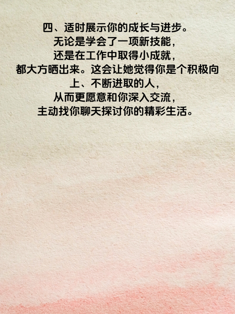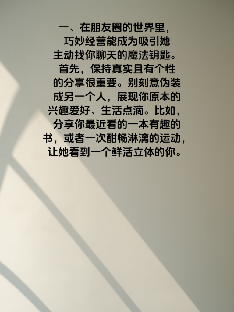 一、在朋友圈的世界里,巧妙经营能成为吸引她主动找你聊天的魔法钥匙。首先,保持真实且有个性的分享很重要。别刻意伪装成另一个人,展现你原本的兴趣爱好、生活点滴。比如,分享你最近看的一本有趣的书,或者一次酣畅淋漓的运动,让她看到一个鲜活立体的你。 二、偶尔发一些富有神秘感的动态也不错。不必把所有事情都交代得清清楚楚,留一点悬念。像是发一张你正在做某事的局部照片,文字只简单描述一下场景,勾起她的好奇心,促使她主动来问你在干嘛。 三、巧妙运用情绪感染。分享开心的事时,用生动活泼的语言;感慨生活不易时,展现出你的坚韧。让她能通过朋友圈感受到你的情绪波动,进而想要靠近你,与你交流,主动开启聊天的话题。 四、适时展示你的成长与进步。无论是学会了一项新技能,还是在工作中取得小成就,都大方晒出来。这会让她觉得你是个积极向上、不断进取的人,从而更愿意和你深入交流,主动找你聊天探讨你的精彩生活。