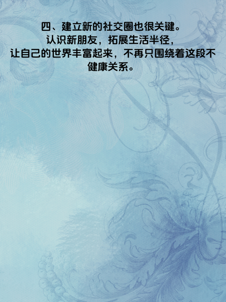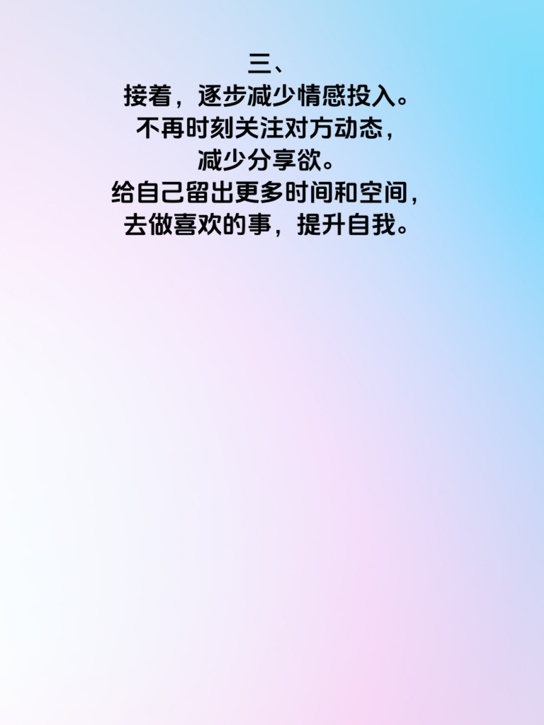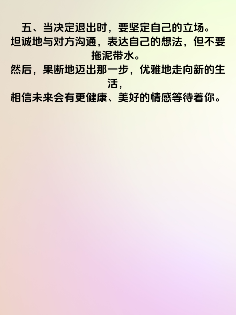 一、在情感的世界里,有时我们会陷入不健康的关系中。想要优雅退出,情感戒断训练就显得尤为重要。 二、首先,要正视这段关系的问题所在。冷静分析双方相处中让你不适的点,是无休止的争吵、过度的控制,还是其他。只有明确问题,才能有针对性地开始戒断。 三、接着,逐步减少情感投入。不再时刻关注对方动态,减少分享欲。给自己留出更多时间和空间,去做喜欢的事,提升自我。 四、建立新的社交圈也很关键。认识新朋友,拓展生活半径,让自己的世界丰富起来,不再只围绕着这段不健康关系。 五、当决定退出时,要坚定自己的立场。坦诚地与对方沟通,表达自己的想法,但不要拖泥带水。然后,果断地迈出那一步,优雅地走向新的生活,相信未来会有更健康、美好的情感等待着你。