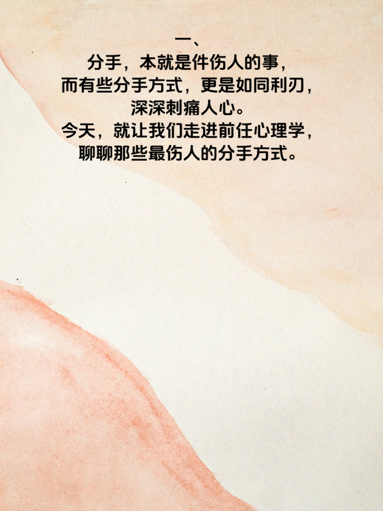 一、分手,本就是件伤人的事,而有些分手方式,更是如同利刃,深深刺痛人心。今天,就让我们走进前任心理学,聊聊那些最伤人的分手方式。 二、冷暴力分手堪称伤人之首。一方毫无征兆地开始冷淡,不沟通、不回应,让另一方在无尽的猜测和煎熬中备受折磨。这种方式不仅切断了情感交流,更让被冷待的一方自尊受挫,怀疑自己的一切。 三、断崖式分手也极其残忍。前一刻还如胶似漆,下一秒却突然提出分手,没有任何过渡和解释。被分手的一方毫无心理准备,瞬间陷入巨大的痛苦和迷茫之中,感觉整个世界都崩塌了。 四、还有那种公开揭短式的分手。将对方的缺点、曾经的矛盾在众人面前曝光,让对方成为笑柄。这会让被分手者陷入深深的羞耻和自卑,对爱情和人性都产生恐惧。 五、了解这些伤人的分手方式,是为了让我们在感情中尽量避免用这样的方式去伤害他人。同时,若不幸遭遇,也要学会自我治愈,勇敢走出阴霾,相信未来会有更美好的爱情等待着我们。