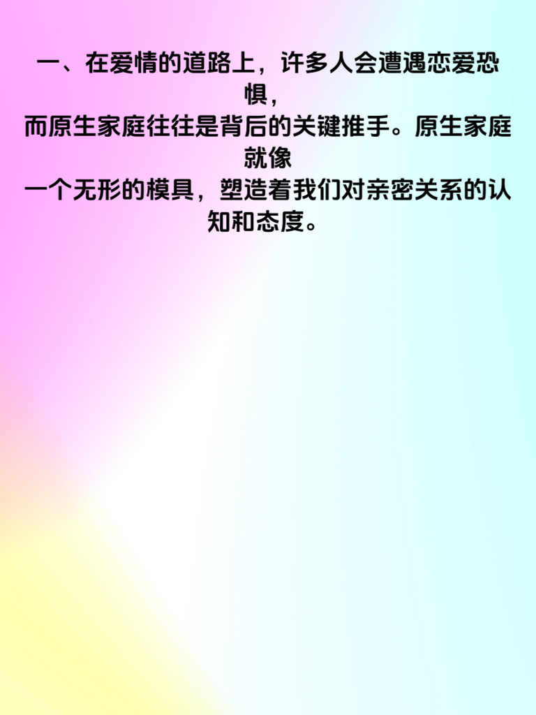 一、在爱情的道路上,许多人会遭遇恋爱恐惧,而原生家庭往往是背后的关键推手。原生家庭就像一个无形的模具,塑造着我们对亲密关系的认知和态度。 二、如果在原生家庭中,父母关系紧张,经常争吵,孩子可能会对亲密关系产生恐惧,害怕自己的感情也会重蹈覆辙。比如,目睹父母的激烈冲突后,孩子内心会觉得亲密关系充满了不稳定和伤害。 三、又或者,父母一方过于强势,另一方过于软弱,孩子可能会在成长过程中形成错误的自我认知,觉得自己在亲密关系中无法真正做自己。 四、要克服这种因原生家庭造成的恋爱恐惧,首先要正视自己内心的担忧。然后,通过与伴侣坦诚沟通,慢慢打破内心的壁垒。同时,不断提升自我认知,明白健康的亲密关系应该是相互尊重、包容和支持的。只有这样,才能走出原生家庭的阴影,勇敢拥抱美好的爱情。
