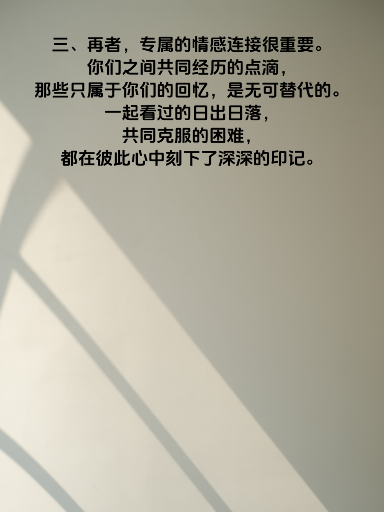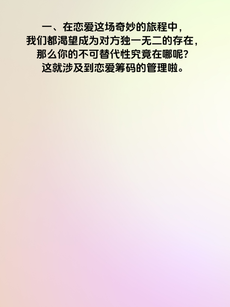 一、在恋爱这场奇妙的旅程中,我们都渴望成为对方独一无二的存在,那么你的不可替代性究竟在哪呢?这就涉及到恋爱筹码的管理啦。 二、首先,自身价值是关键筹码。它涵盖了内在与外在。丰富的内涵能让你在交流中展现独特见解,吸引对方深入了解。良好的外在形象与气质,也是给人留下好印象的开始。比如不断提升自己的知识储备,培养兴趣爱好,健身塑形保持健康活力,都能增加你的吸引力。 三、再者,专属的情感连接很重要。你们之间共同经历的点滴,那些只属于你们的回忆,是无可替代的。一起看过的日出日落,共同克服的困难,都在彼此心中刻下了深深的印记。 四、还有,独特的个性魅力也不容忽视。或许你幽默风趣,能随时逗对方开心;或许你温柔体贴,总能在细微处给予关怀。展现真实的自己,发挥独特优势,让对方在茫茫人海中一眼就认定你。 五、恋爱筹码管理并非一蹴而就,而是需要我们用心去经营,不断提升自己,珍惜彼此的情感,才能让自己在对方心中拥有无可替代的位置,收获长久美好的爱情。