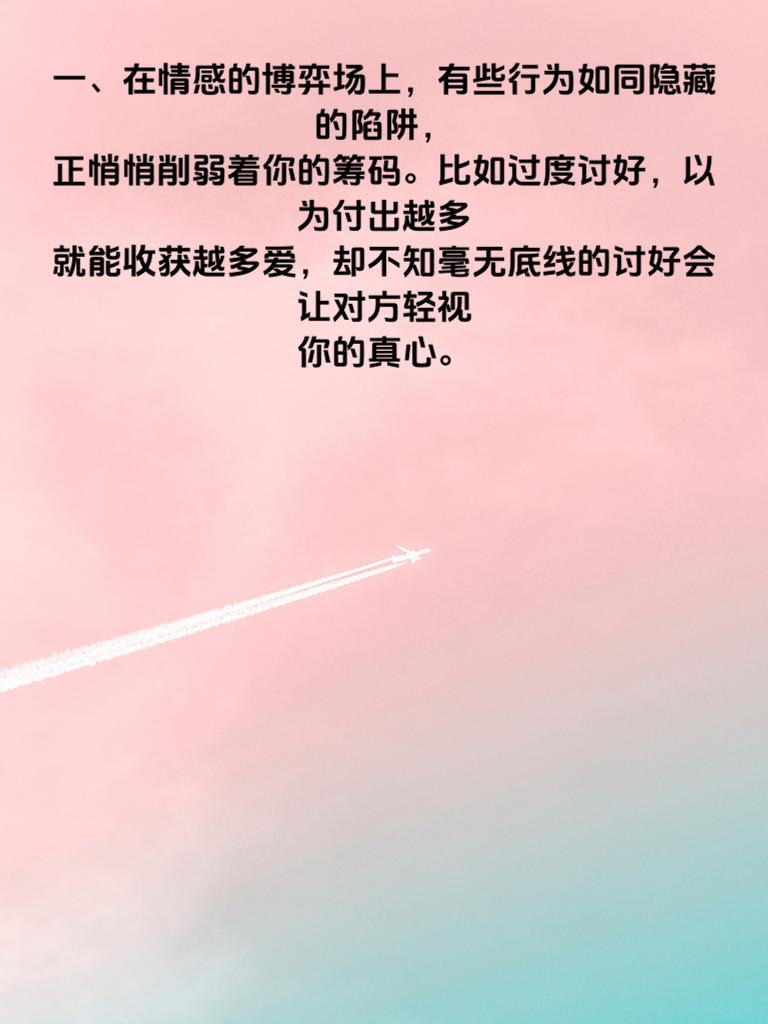 一、在情感的博弈场上,有些行为如同隐藏的陷阱,正悄悄削弱着你的筹码。比如过度讨好,以为付出越多就能收获越多爱,却不知毫无底线的讨好会让对方轻视你的真心。 二、又或者是一味迎合,对方说什么都点头称是,失去了自己的主见和个性,在感情里逐渐迷失自我,也让对方难以真正欣赏你。 三、还有情绪不稳定,时而大发脾气,时而过度敏感,这种反复无常会让对方感到疲惫和不安,不敢轻易靠近。 四、再者,缺乏自我提升,当生活只有围绕着对方转,自身没有成长和进步,魅力也会随之递减。 五、要明白,在情感博弈中,保持自我、适度付出、稳定情绪、不断成长才是增加筹码的关键,如此才能在爱情里收获平等且长久的幸福。