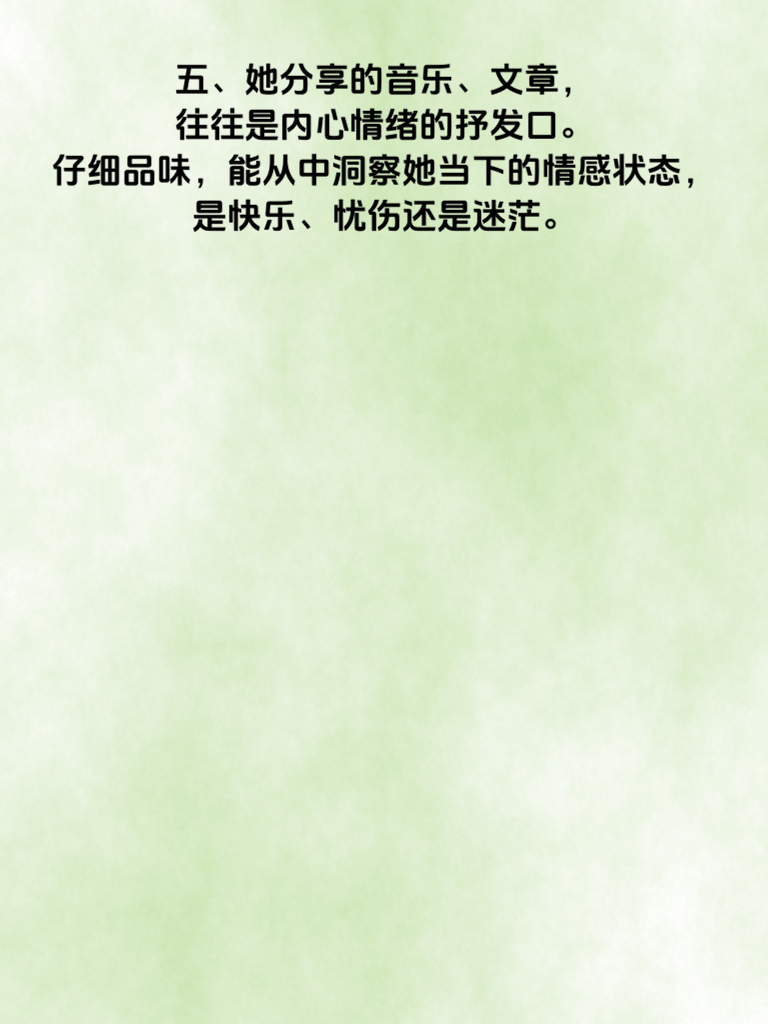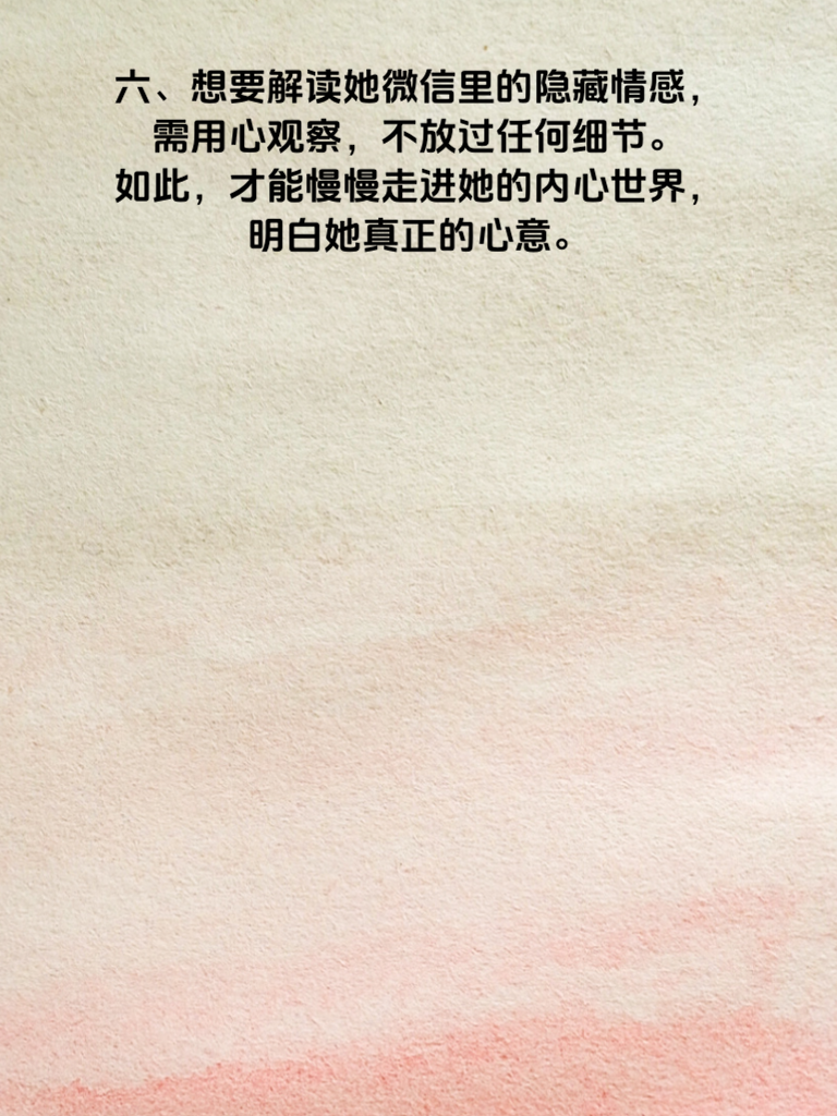 一、在男性视角下,微信就像一本记录女性情感的隐秘日记。她的每一条朋友圈、每一次聊天回复,都可能暗藏玄机。 二、比如她频繁更换的微信头像,或许并非随意为之。可能是她当下心境的映射,渴望展现新的自己,或者是在期待某个人的关注。 三、再看她的朋友圈动态,那些仅对部分人可见的内容,说不定藏着她不愿示人的小心思。也许是一段未公开的感情,或是心底深处的秘密渴望。 四、聊天时她的回复速度和语气也值得玩味。秒回可能表示她对你兴趣浓厚,而回复简短冷淡,或许她正有所顾虑。 五、她分享的音乐、文章,往往是内心情绪的抒发口。仔细品味,能从中洞察她当下的情感状态,是快乐、忧伤还是迷茫。 六、想要解读她微信里的隐藏情感,需用心观察,不放过任何细节。如此,才能慢慢走进她的内心世界,明白她真正的心意。