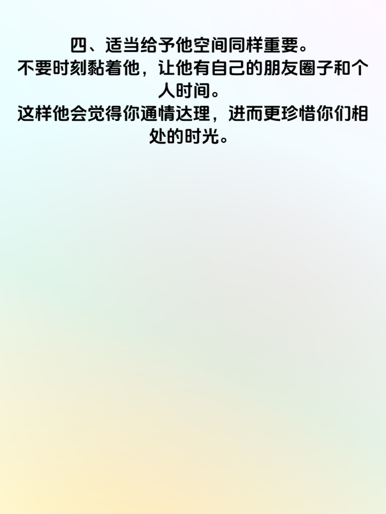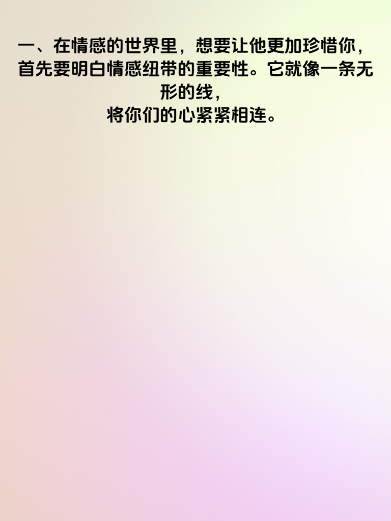 一、在情感的世界里,想要让他更加珍惜你,首先要明白情感纽带的重要性。它就像一条无形的线,将你们的心紧紧相连。 二、保持一定的神秘感是关键。不要把自己的一切毫无保留地展现出来,偶尔藏起一点小惊喜,让他对你始终充满好奇。比如,你有一项独特的才艺,不用每次见面都立刻展示,在合适的时机不经意地露一手,会让他对你刮目相看。 三、尊重他的想法和感受也不可或缺。认真倾听他的观点,即使有不同意见,也以平和的方式沟通。当他感受到你对他的尊重,便会更加珍视与你的交流。 四、适当给予他空间同样重要。不要时刻黏着他,让他有自己的朋友圈子和个人时间。这样他会觉得你通情达理,进而更珍惜你们相处的时光。 五、展现你的独特魅力,无论是内在的温柔善良,还是外在的优雅气质。让他意识到你是独一无二的,无可替代,他自然会更加珍惜你这个特别的存在。