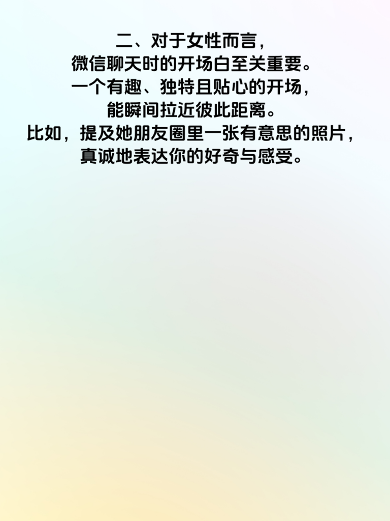 一、在微信聊天这个虚拟空间里,藏着无数女性的情感秘密。每一条消息、每一次回复,都可能是她们内心情绪的折射。 二、对于女性而言,微信聊天时的开场白至关重要。一个有趣、独特且贴心的开场,能瞬间拉近彼此距离。比如,提及她朋友圈里一张有意思的照片,真诚地表达你的好奇与感受。 三、聊天过程中,认真倾听是关键。不要急于表达自己,给她足够时间阐述想法和感受。适时给予肯定回应,让她知道你在用心聆听。 四、懂得捕捉她言语中的情绪。若她语气低落,及时给予安慰;若兴奋分享,热情回应。这种情感共鸣能加深彼此关系。 五、巧妙运用表情包也能增添聊天乐趣。合适的表情包能生动传达你的情绪,避免文字的生硬,让聊天氛围更轻松愉快。 六、最后,保持聊天的节奏感。既不能过于频繁让她有压力,也不能间隔太久让她觉得被冷落。把握好度,才能在微信聊天中解开情感密码,走进她的内心世界。