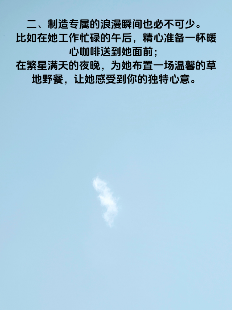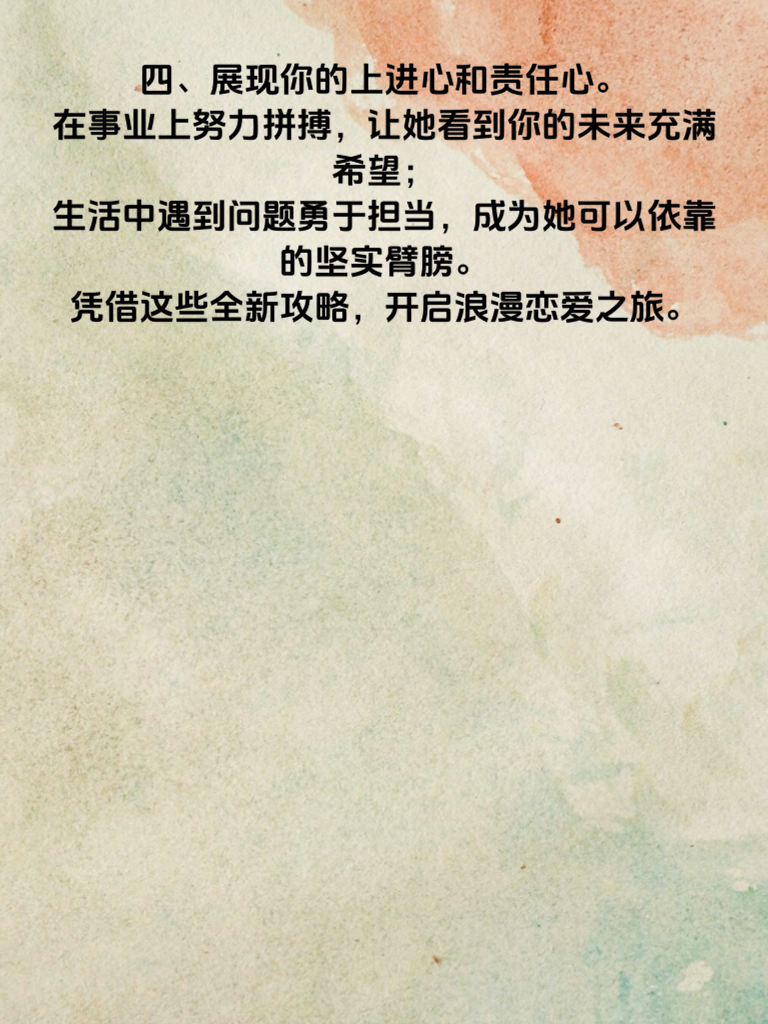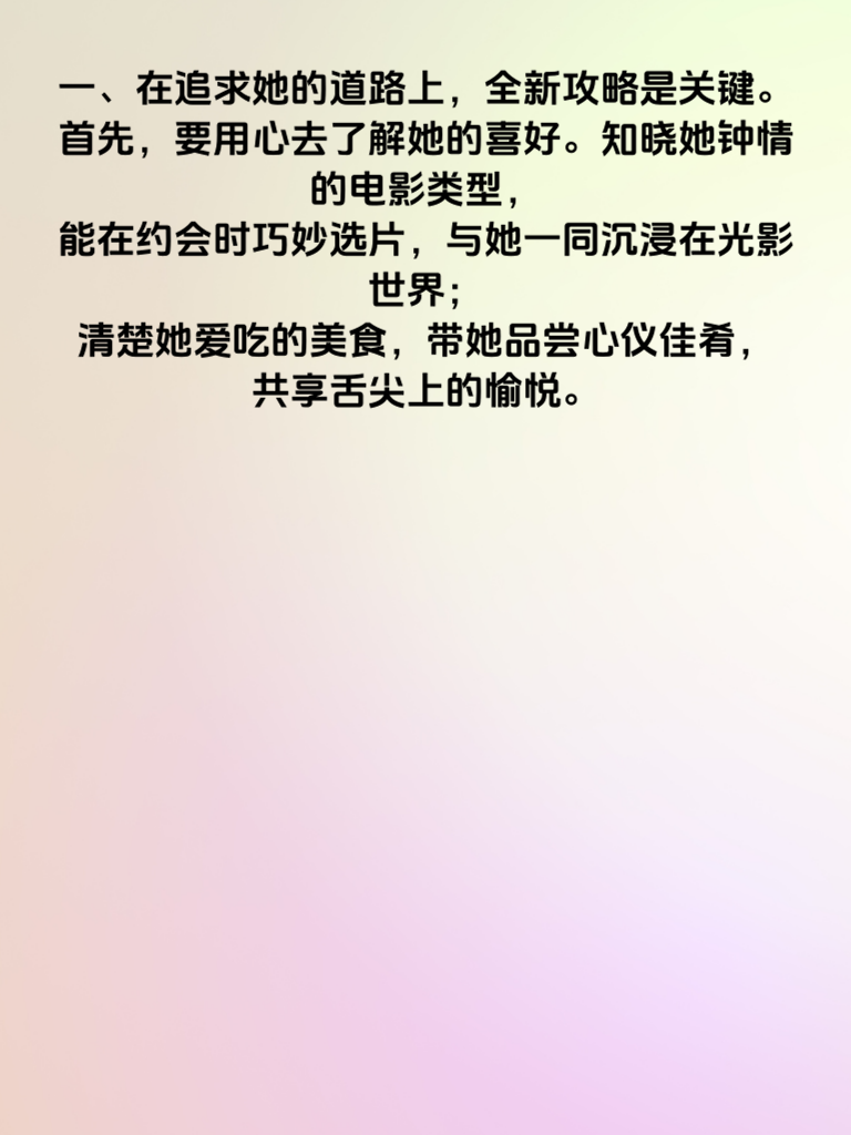 一、在追求她的道路上,全新攻略是关键。首先,要用心去了解她的喜好。知晓她钟情的电影类型,能在约会时巧妙选片,与她一同沉浸在光影世界;清楚她爱吃的美食,带她品尝心仪佳肴,共享舌尖上的愉悦。 二、制造专属的浪漫瞬间也必不可少。比如在她工作忙碌的午后,精心准备一杯暖心咖啡送到她面前;在繁星满天的夜晚,为她布置一场温馨的草地野餐,让她感受到你的独特心意。 三、沟通更是重中之重。真诚地倾听她的想法、烦恼与梦想,用理解与支持回应她。同时,清晰表达自己的情感与观点,让彼此的心越靠越近。 四、展现你的上进心和责任心。在事业上努力拼搏,让她看到你的未来充满希望;生活中遇到问题勇于担当,成为她可以依靠的坚实臂膀。凭借这些全新攻略,开启浪漫恋爱之旅。
