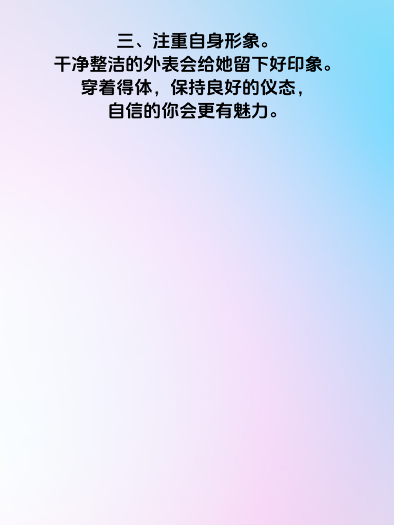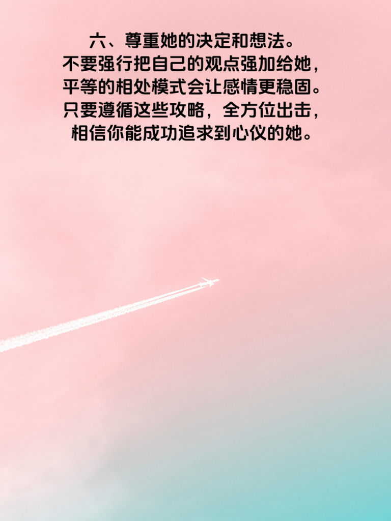 一、追求女生,首先要用心去了解她。知道她的兴趣爱好,才能找到共同话题。比如她爱读书,你就可以聊聊最近读过的好书,分享彼此的感悟。 二、展现真诚是关键。不要虚情假意,用实际行动让她感受到你的真心。在她需要时及时出现,给予温暖的陪伴和支持。 三、注重自身形象。干净整洁的外表会给她留下好印象。穿着得体,保持良好的仪态,自信的你会更有魅力。 四、聊天时学会倾听。让她尽情表达自己的想法,适时给予回应和肯定。不要总是自己滔滔不绝,忽略她的感受。 五、制造一些小惊喜。可以是一份她喜欢的小礼物,或者精心准备的一次约会。让她感受到你的用心和独特。 六、尊重她的决定和想法。不要强行把自己的观点强加给她,平等的相处模式会让感情更稳固。只要遵循这些攻略,全方位出击,相信你能成功追求到心仪的她。