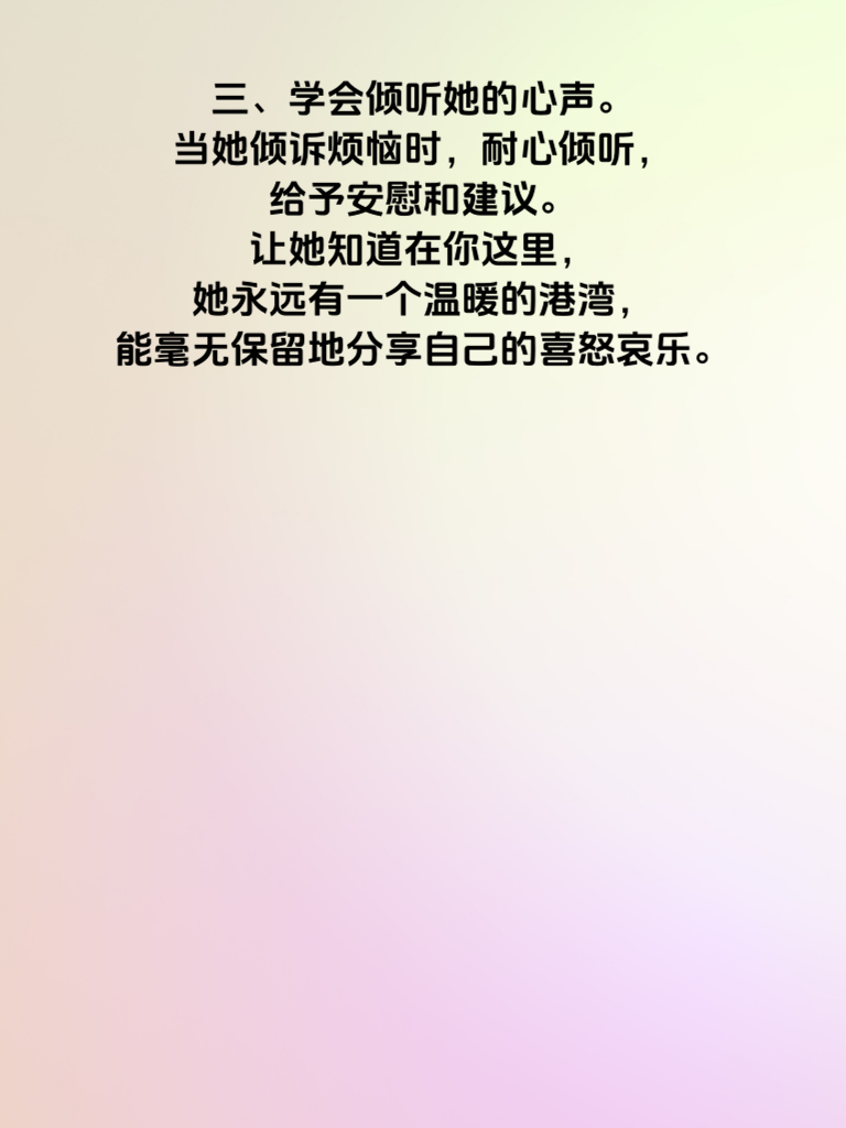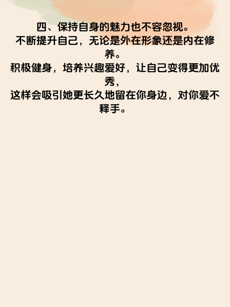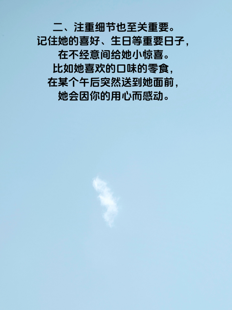 一、恋爱达人新篇章开启,想让她对你爱不释手?其实并不难。首先要明白,真诚是永远的必杀技。真心对待她,让她感受到你独一无二的爱意,这份真诚会像基石一样,为你们的感情打下坚实基础。 二、注重细节也至关重要。记住她的喜好、生日等重要日子,在不经意间给她小惊喜。比如她喜欢的口味的零食,在某个午后突然送到她面前,她会因你的用心而感动。 三、学会倾听她的心声。当她倾诉烦恼时,耐心倾听,给予安慰和建议。让她知道在你这里,她永远有一个温暖的港湾,能毫无保留地分享自己的喜怒哀乐。 四、保持自身的魅力也不容忽视。不断提升自己,无论是外在形象还是内在修养。积极健身,培养兴趣爱好,让自己变得更加优秀,这样会吸引她更长久地留在你身边,对你爱不释手。